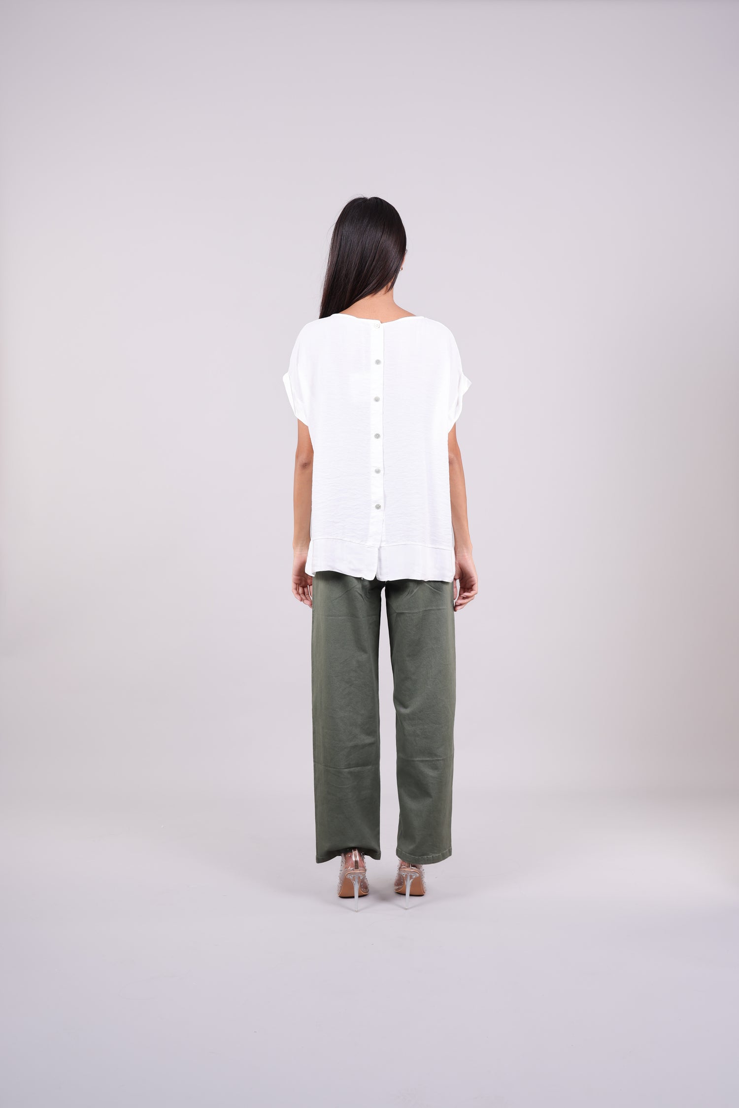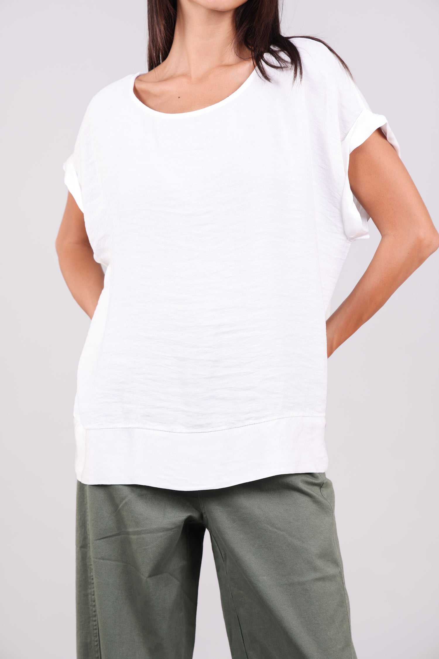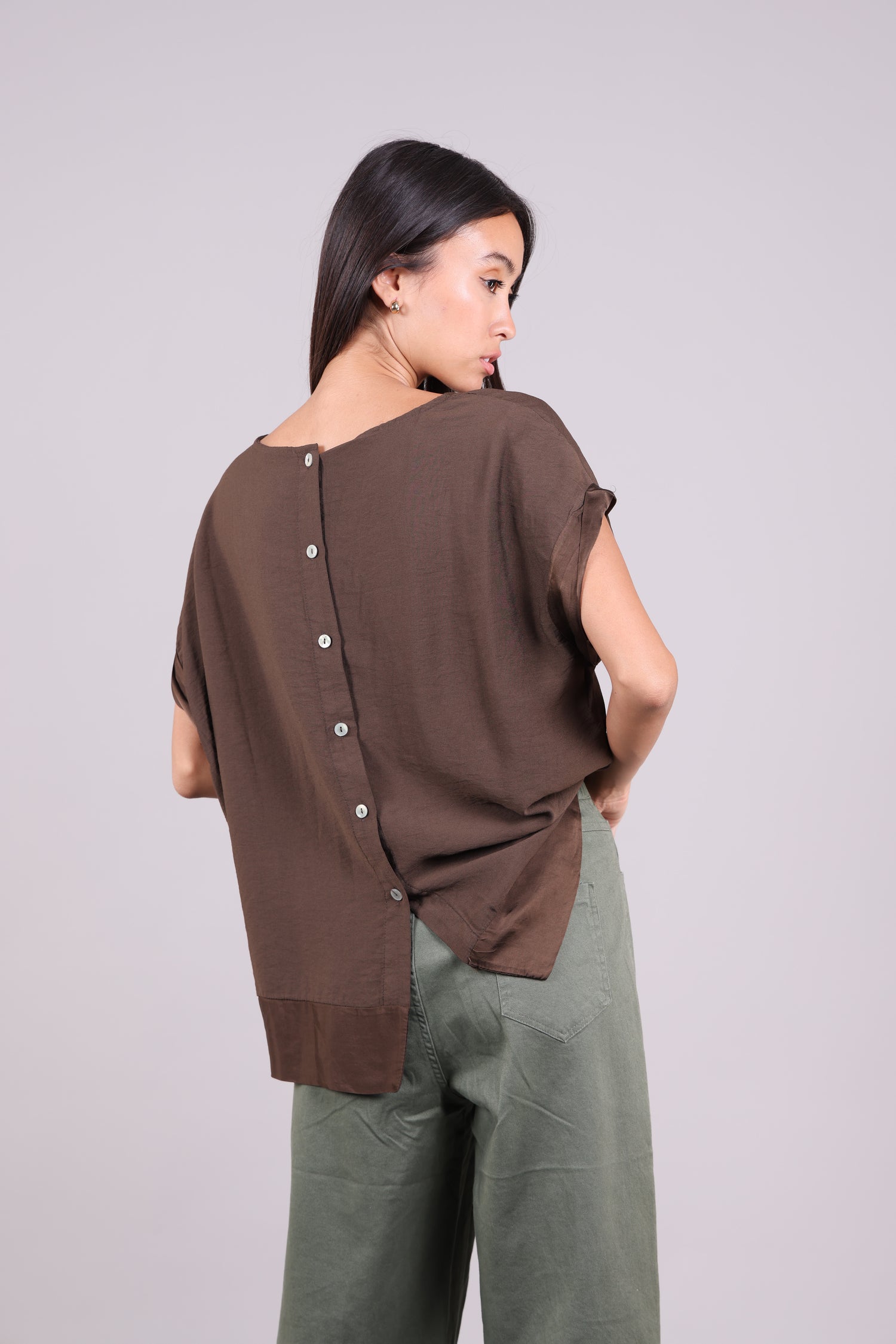 A relaxed short-sleeve blouse featuring a soft contrast hem, rolled sleeves, and a row of delicate back buttons for an elegant twist. A perfect blend of minimal and refined styling.