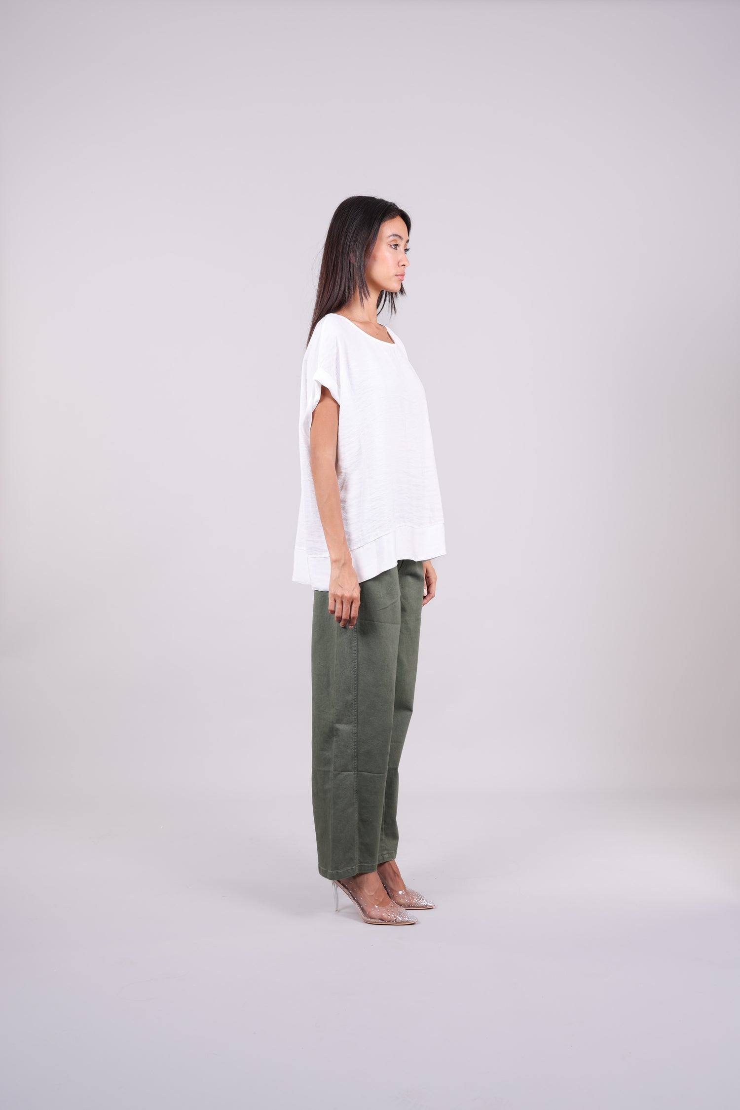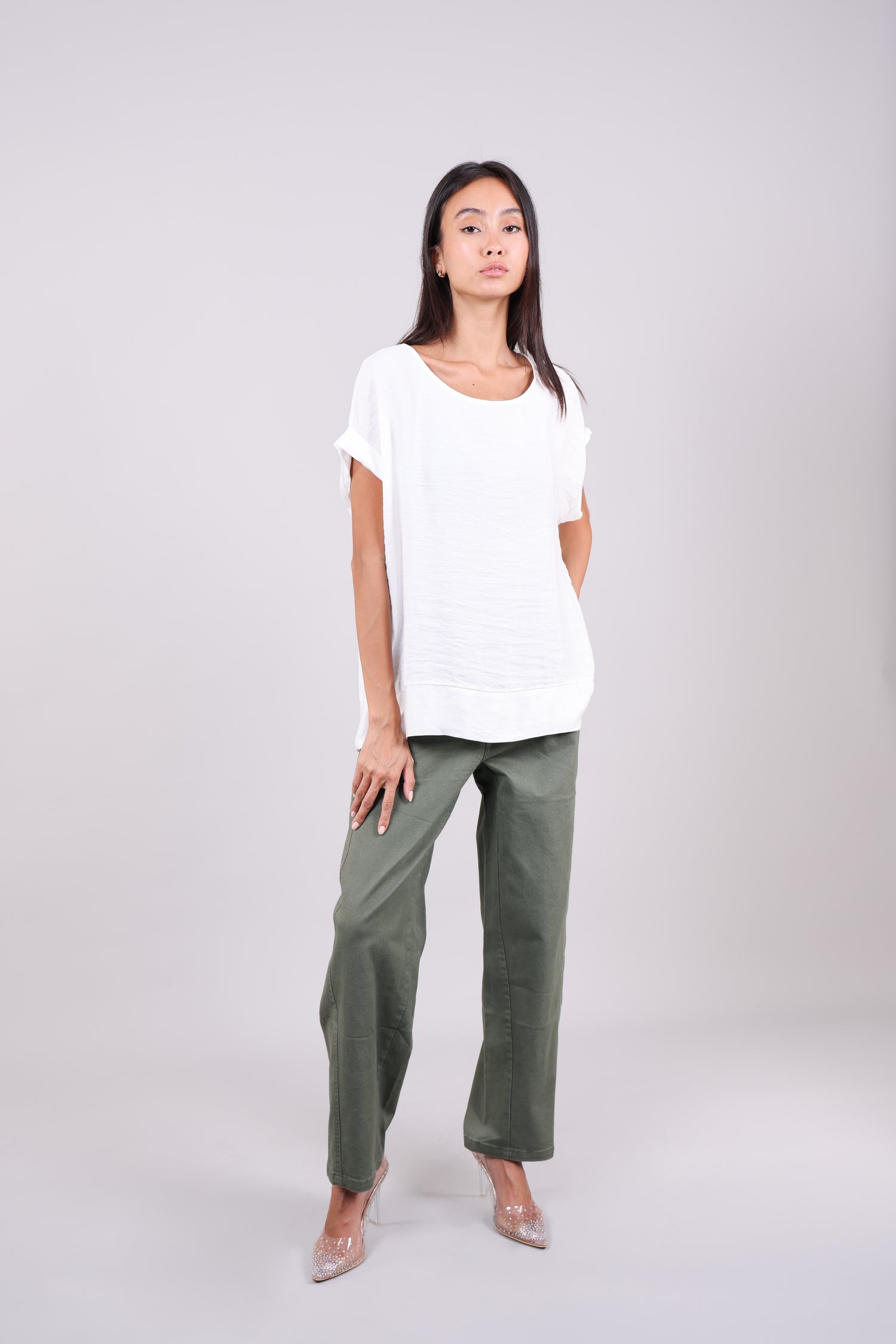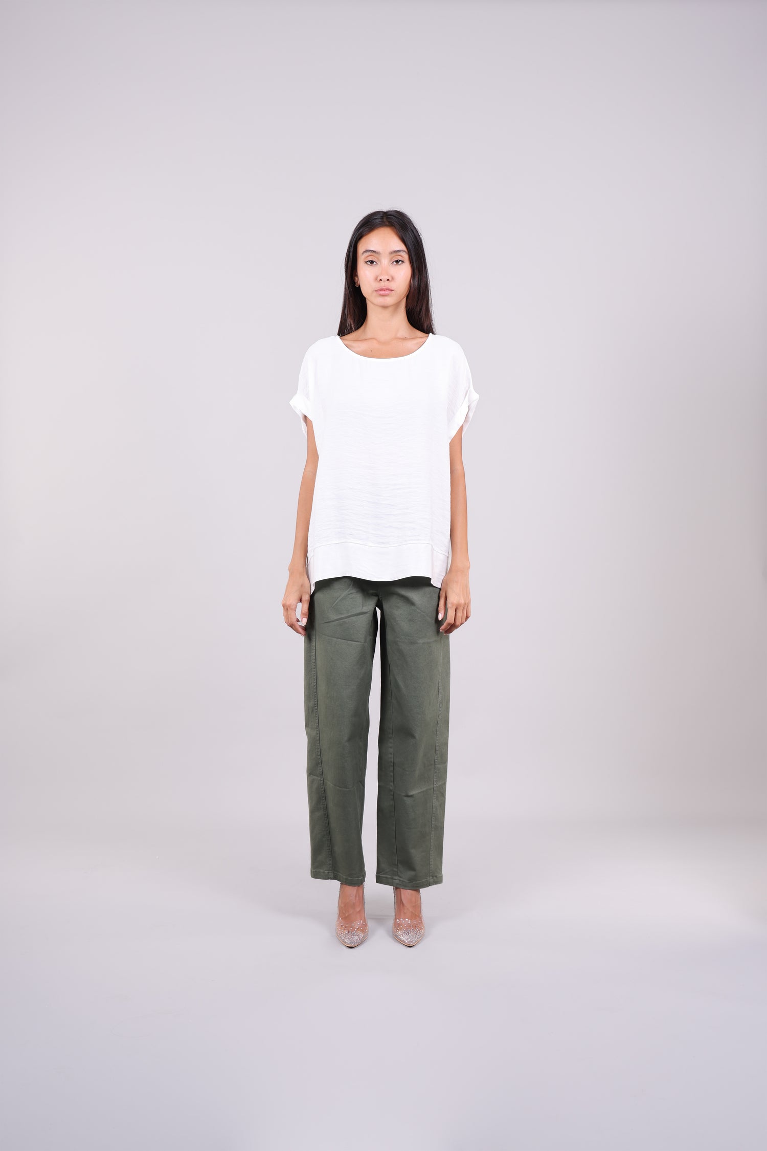 A relaxed short-sleeve blouse featuring a soft contrast hem, rolled sleeves, and a row of delicate back buttons for an elegant twist. A perfect blend of minimal and refined styling.
