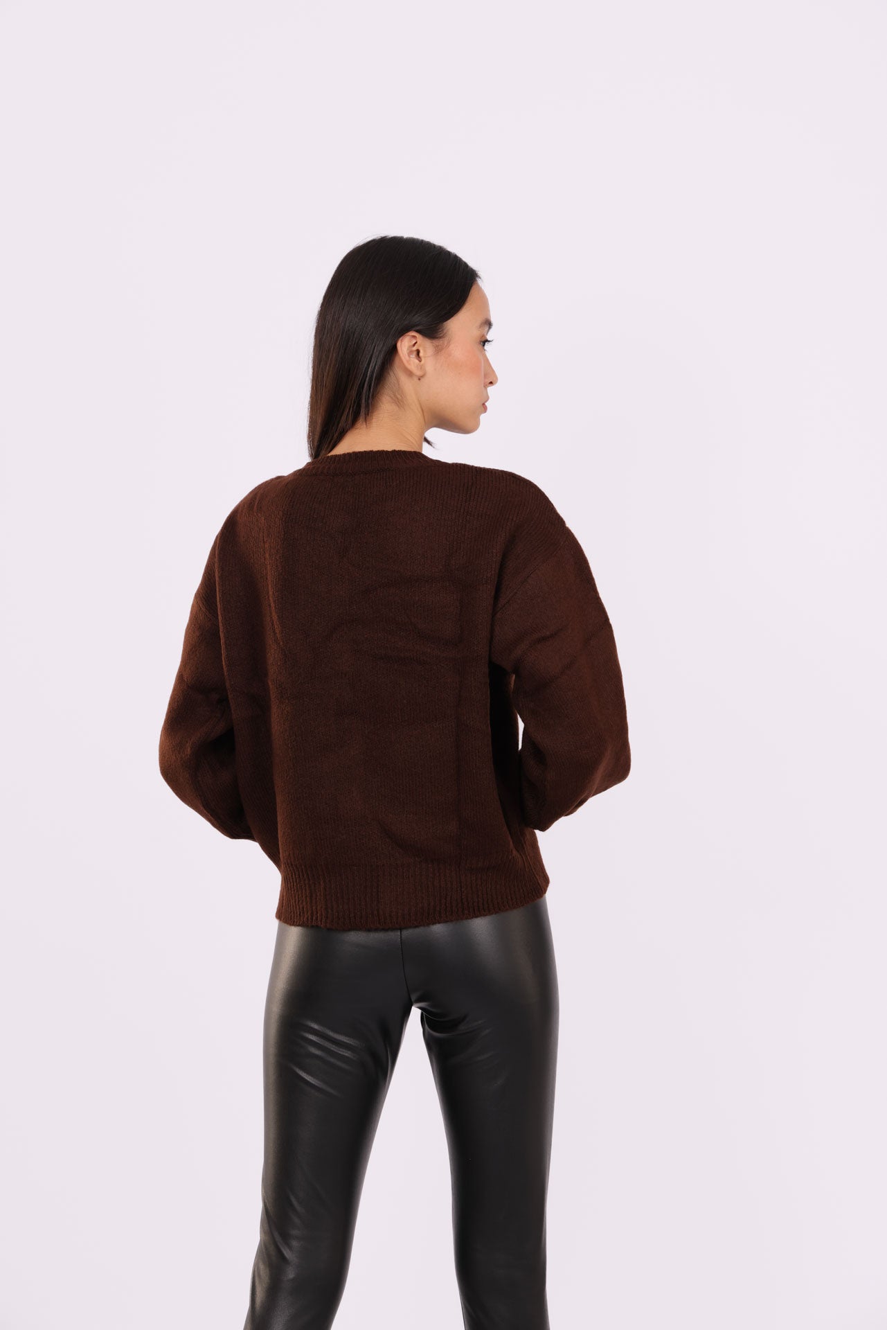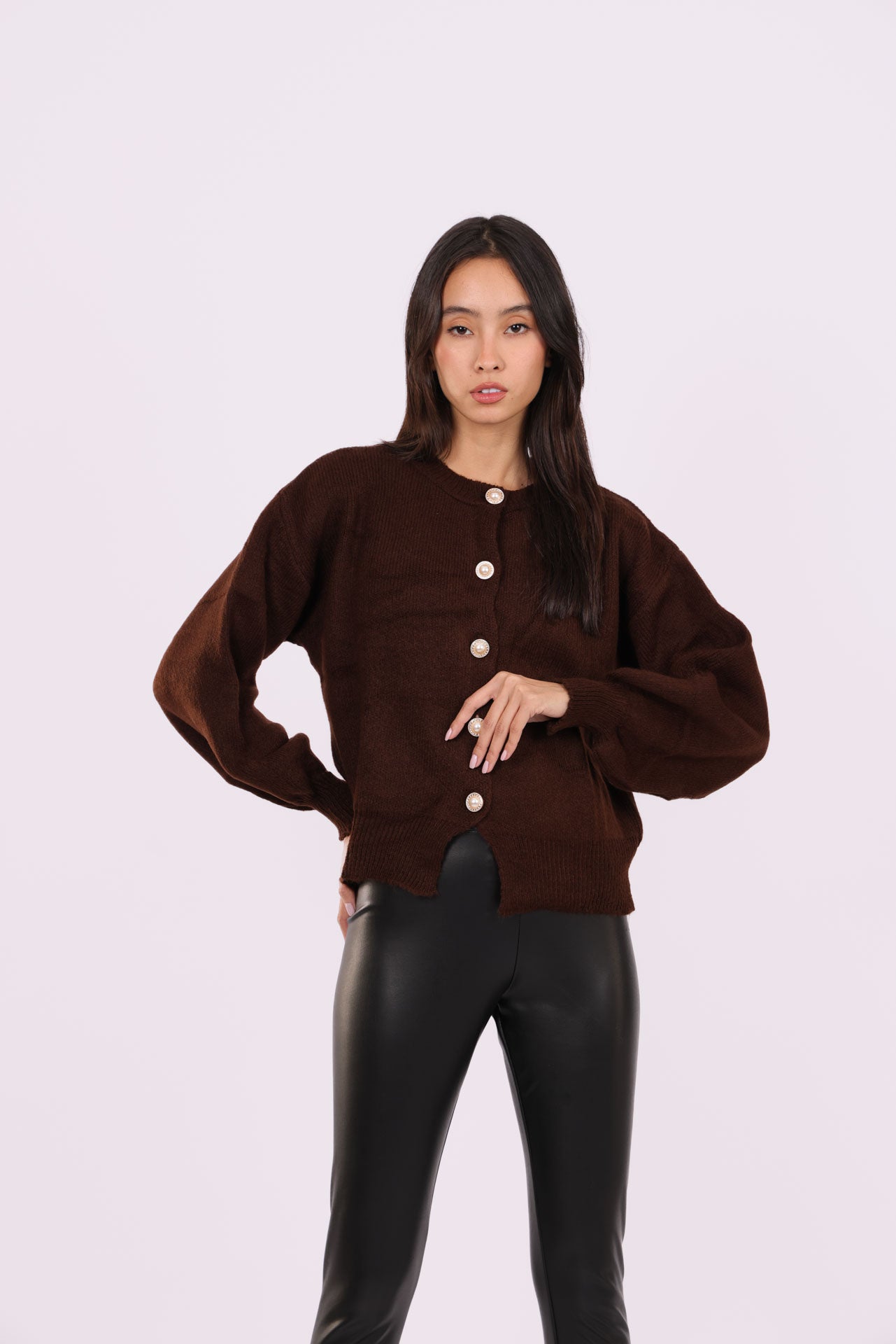 A chic cropped cardigan featuring soft puff sleeves and statement front buttons. Designed with a cozy knit texture and a flattering, easy-fit silhouette — perfect for pairing with high-waisted pants, skirts, or faux leather pieces for an elevated everyday look.