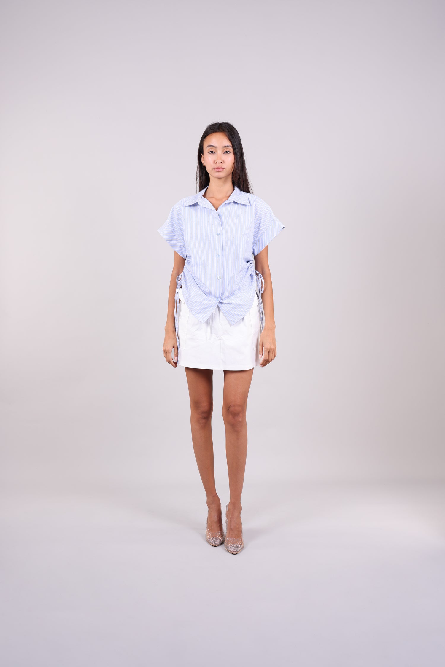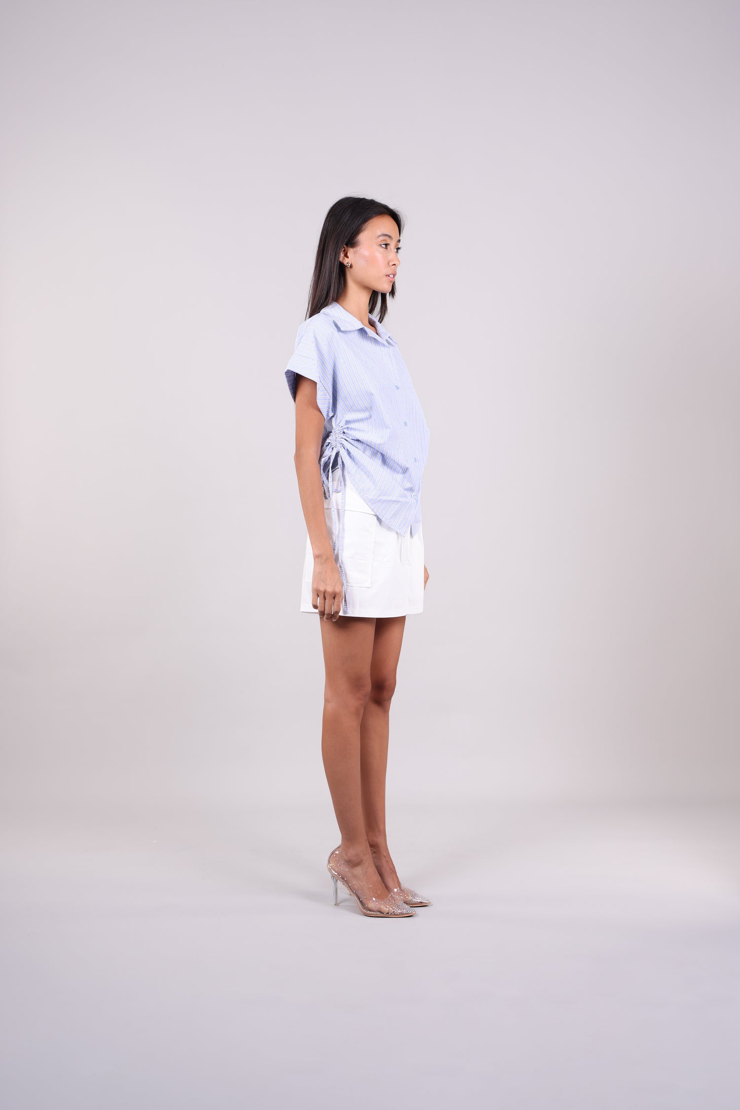A short-sleeve, button-up shirt featuring subtle stripes and adjustable side drawstrings for a customizable fit. Lightweight and relaxed with a modern twist on a classic silhouette.
