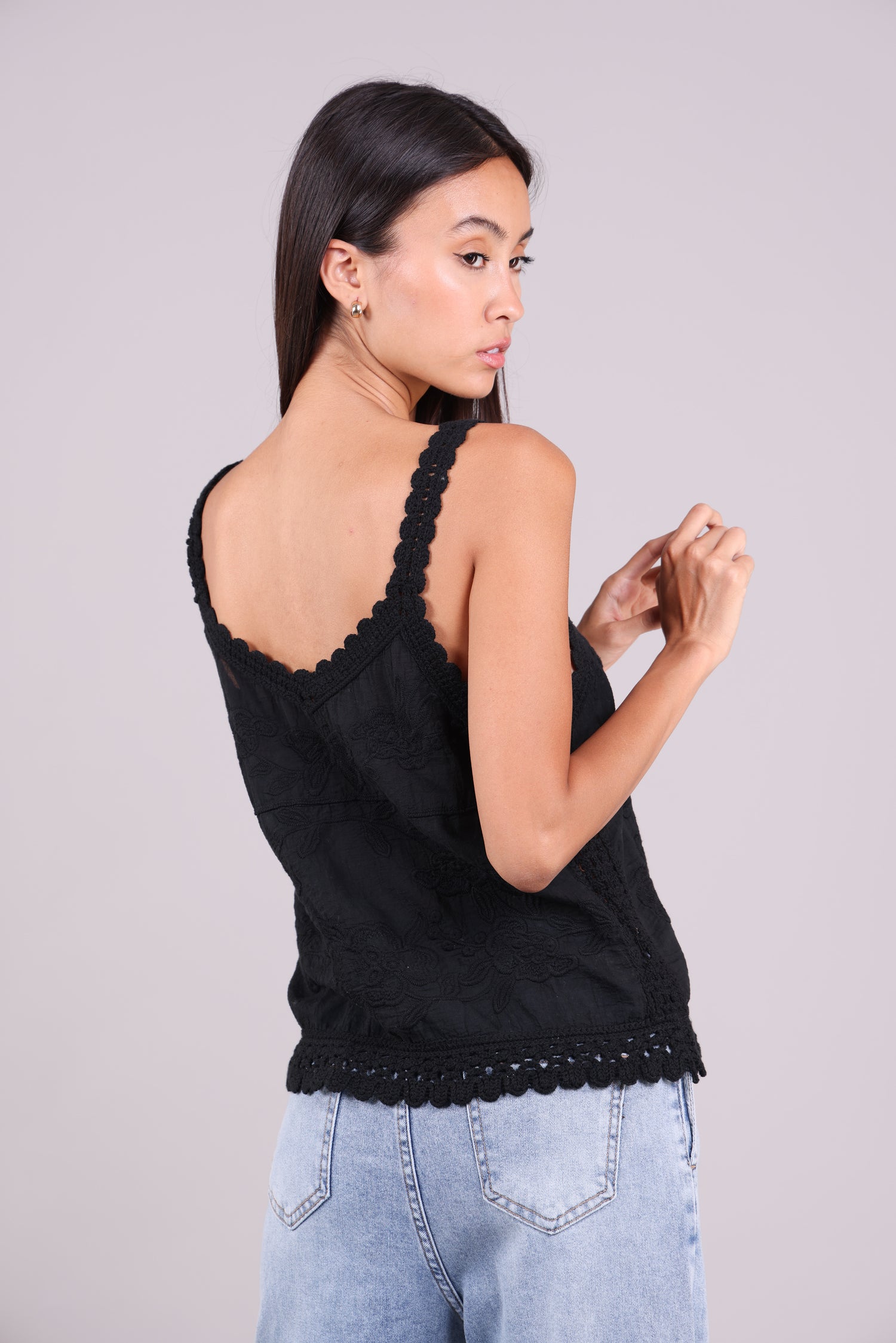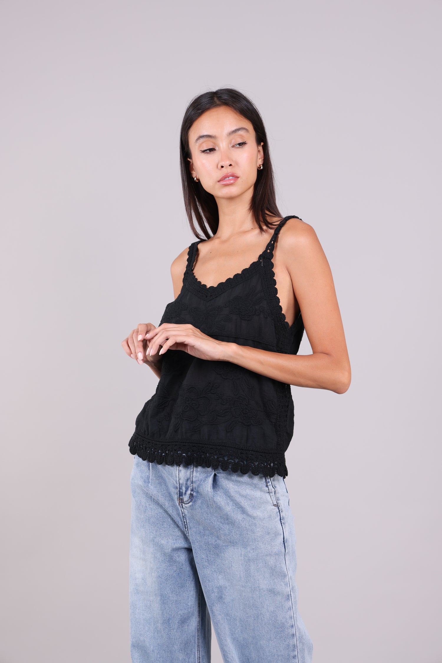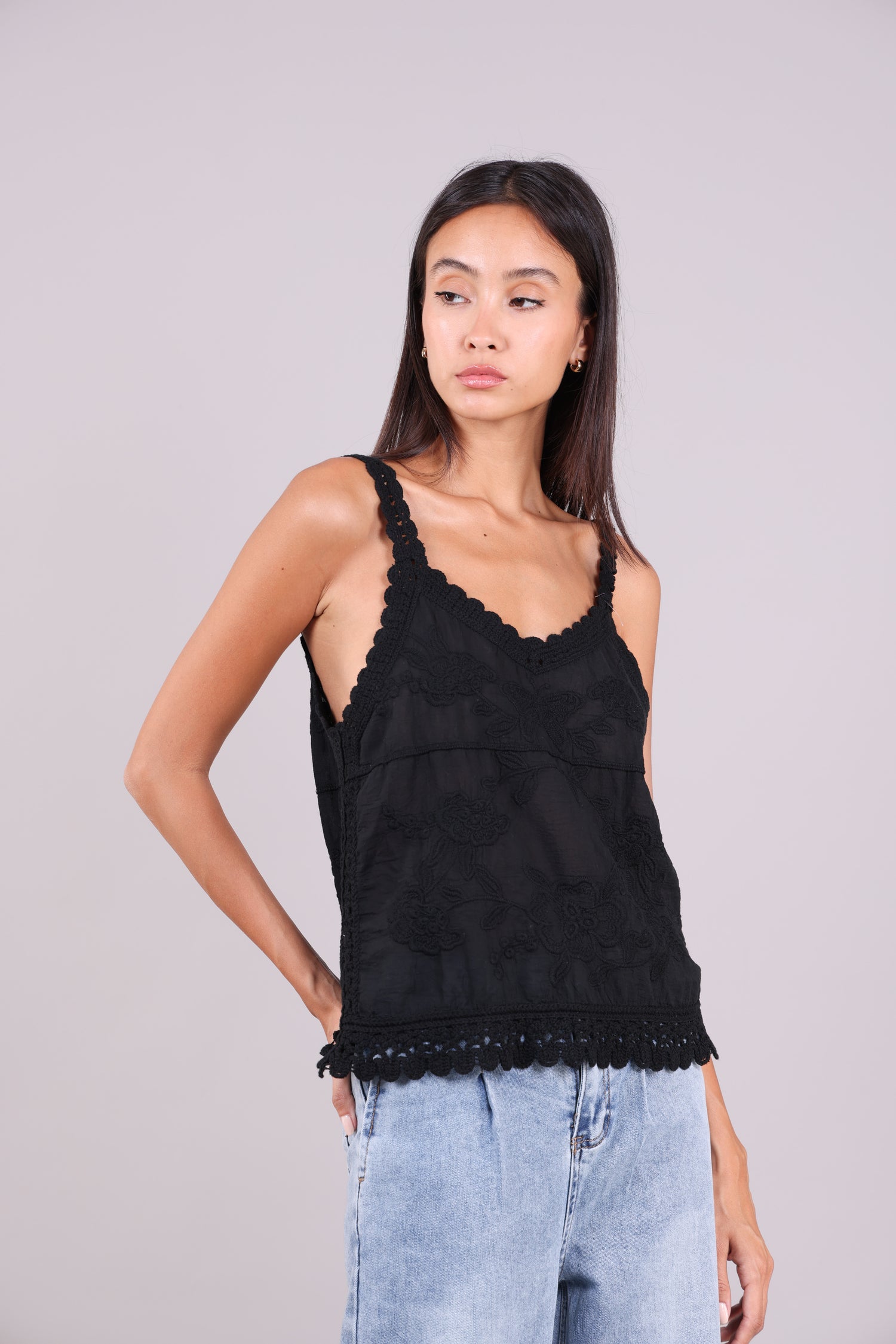 A lightweight Cami featuring floral embroidery, scalloped crochet lace straps, and hem for a delicate, feminine finish.