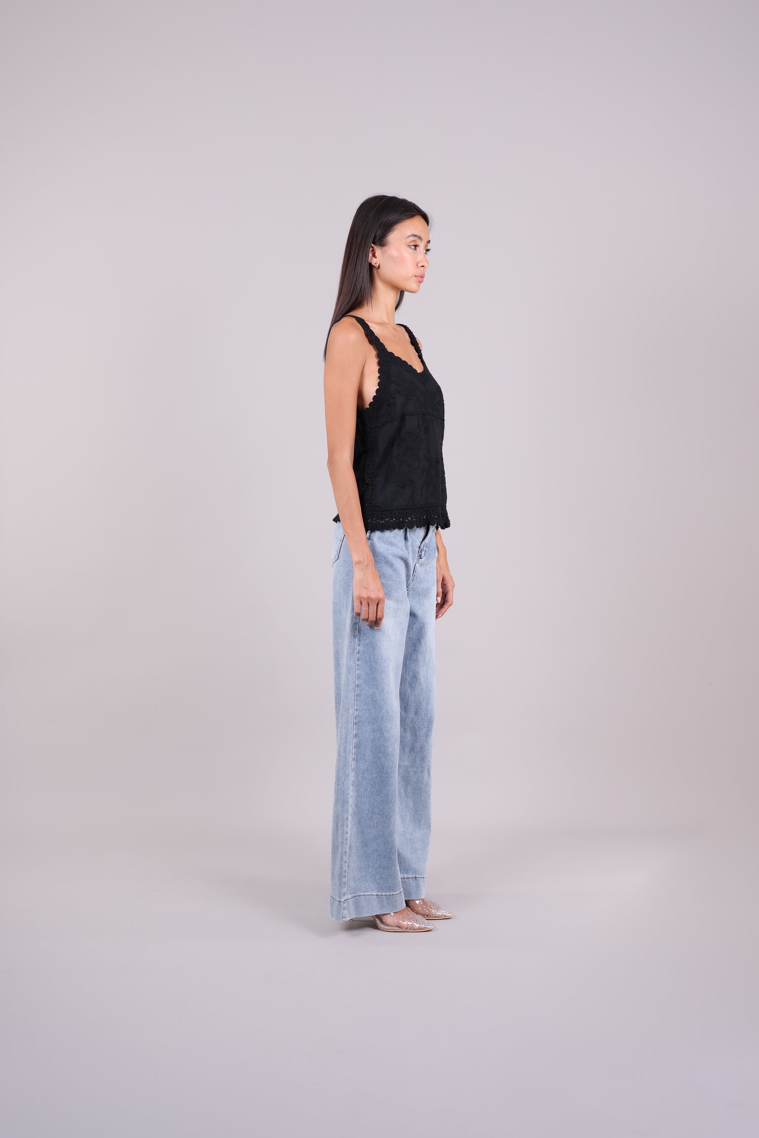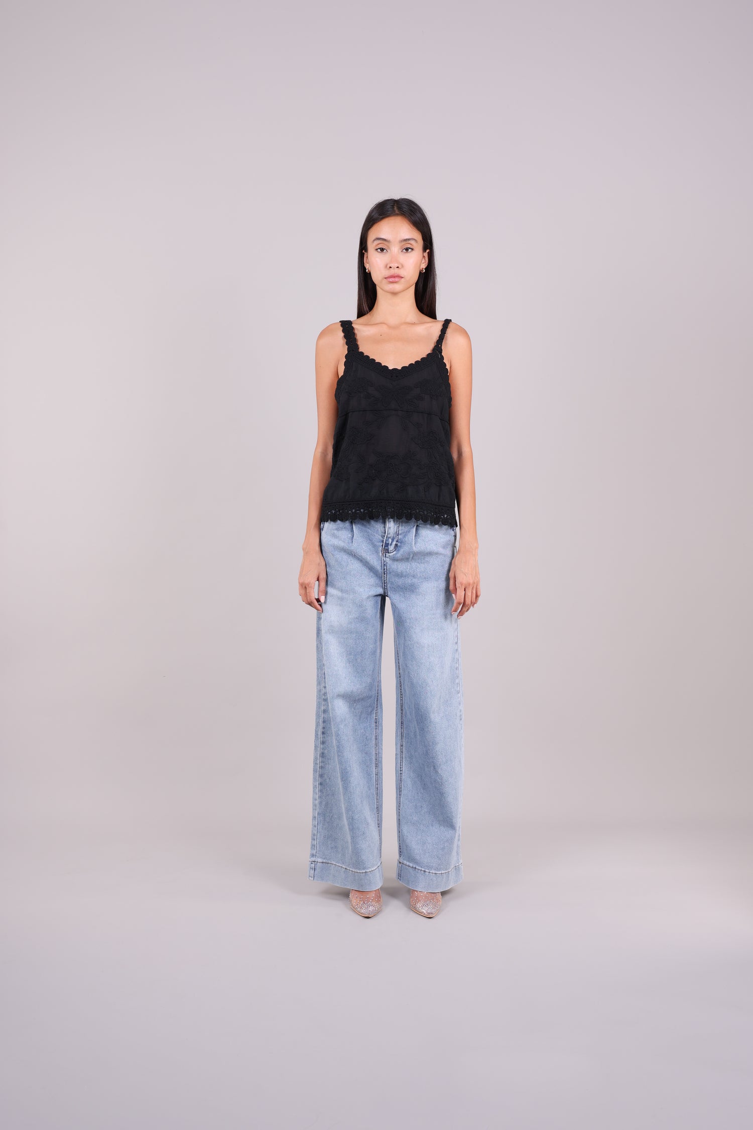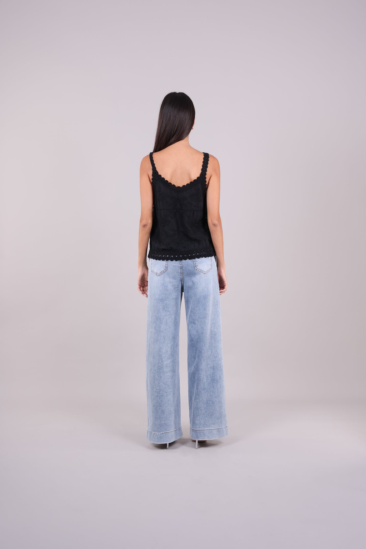 A lightweight Cami featuring floral embroidery, scalloped crochet lace straps, and hem for a delicate, feminine finish.