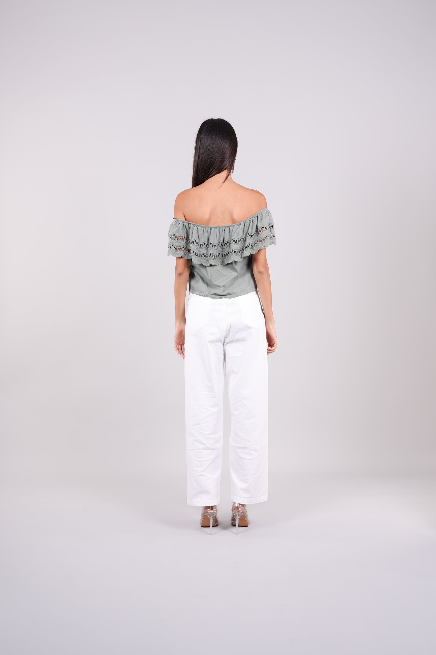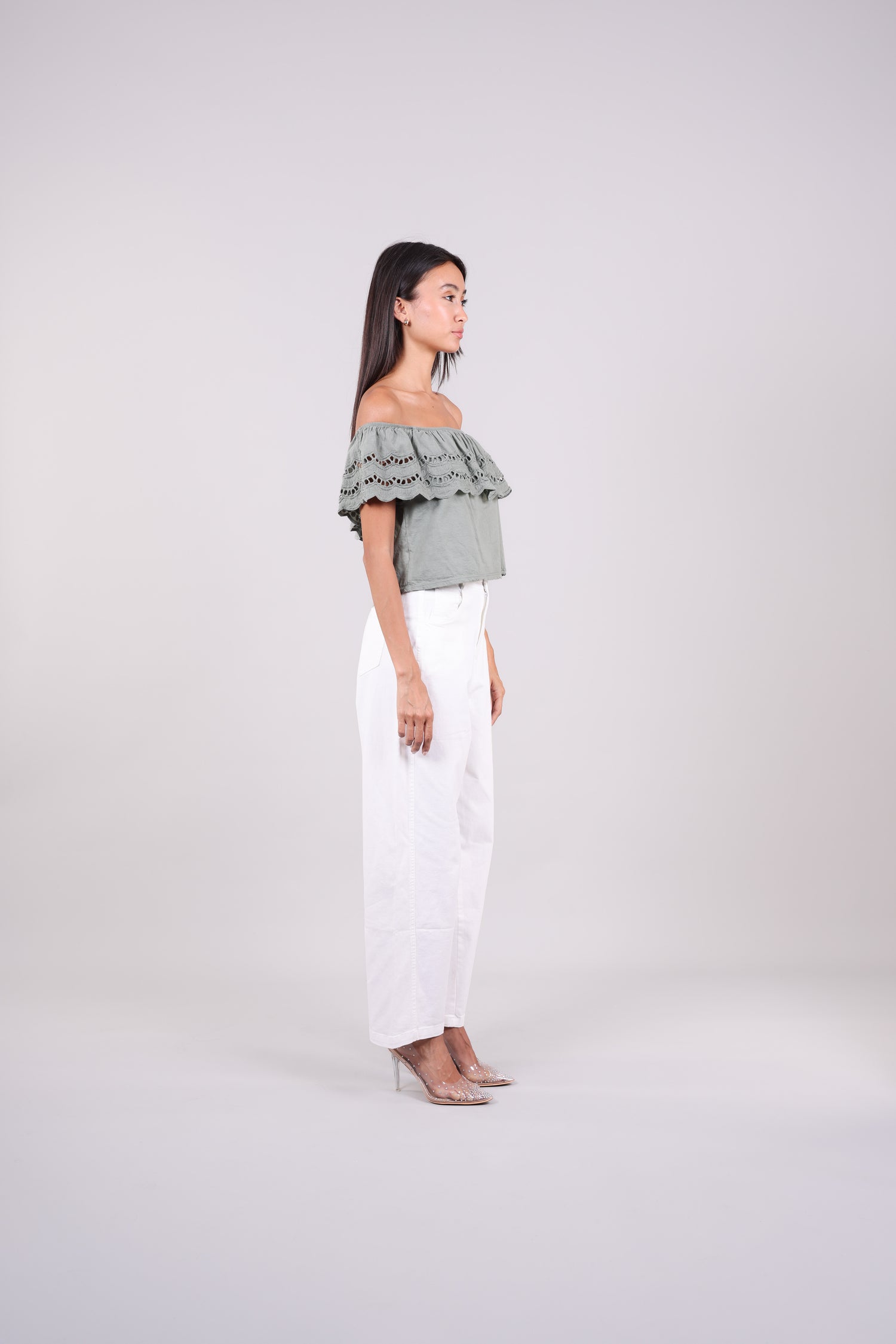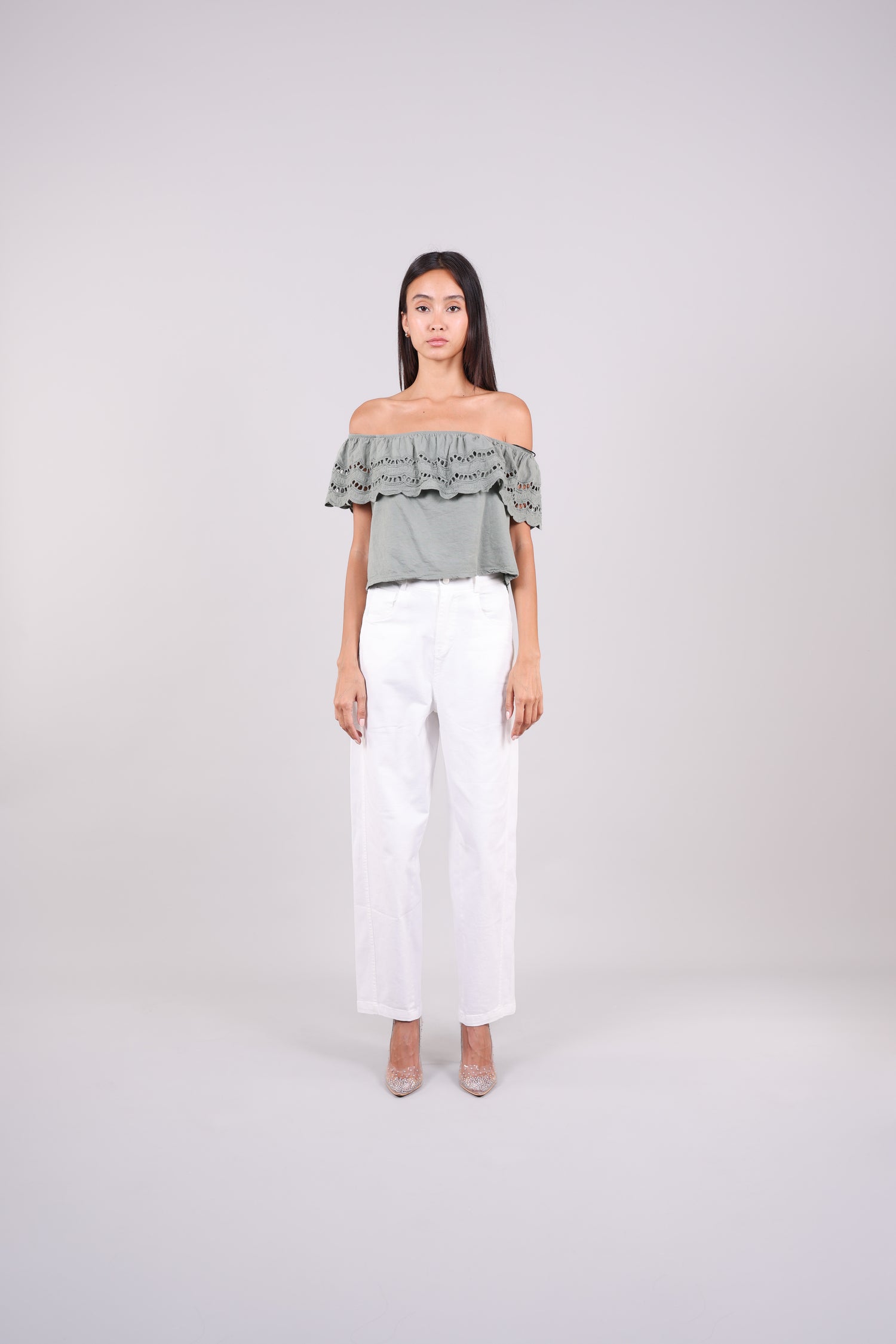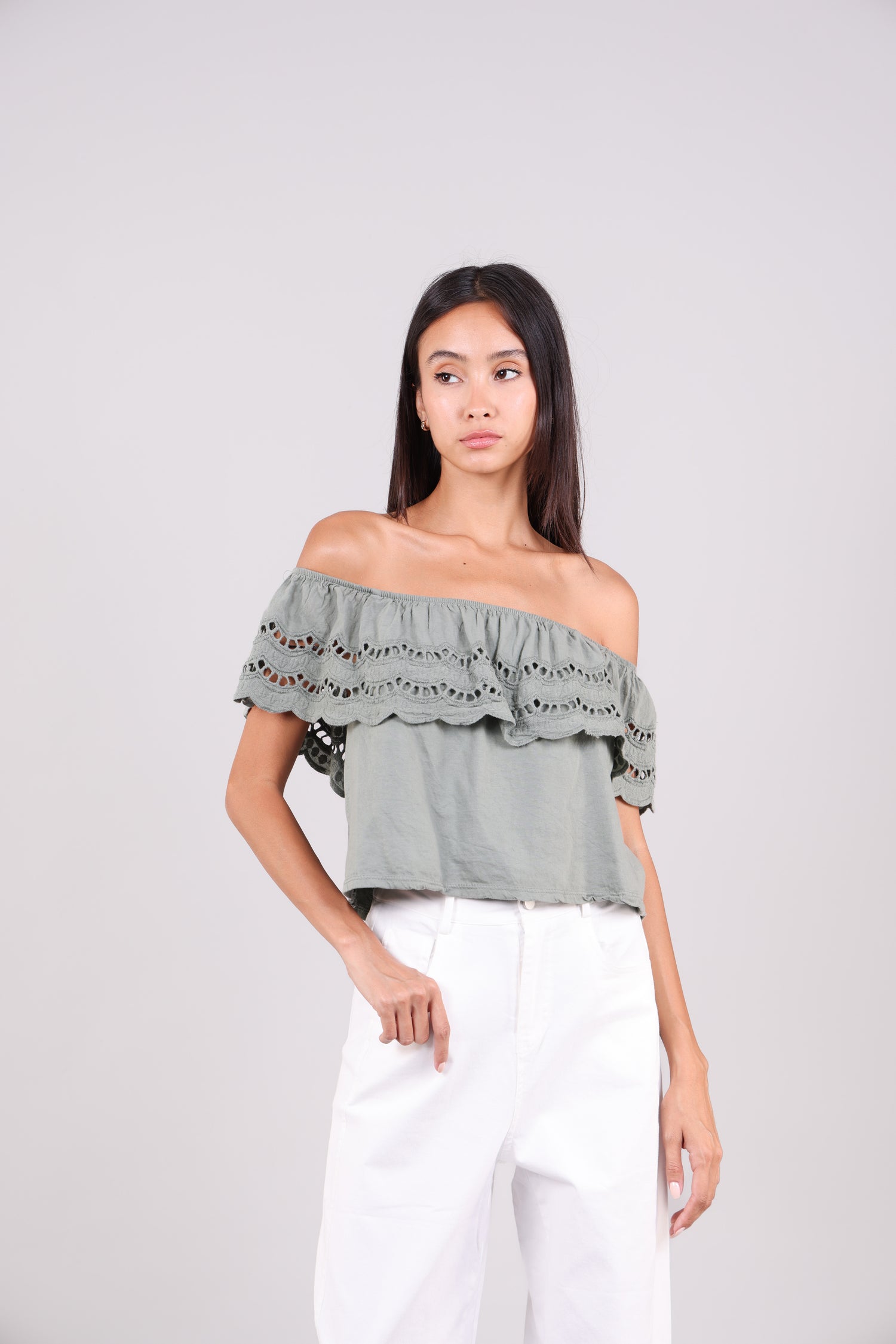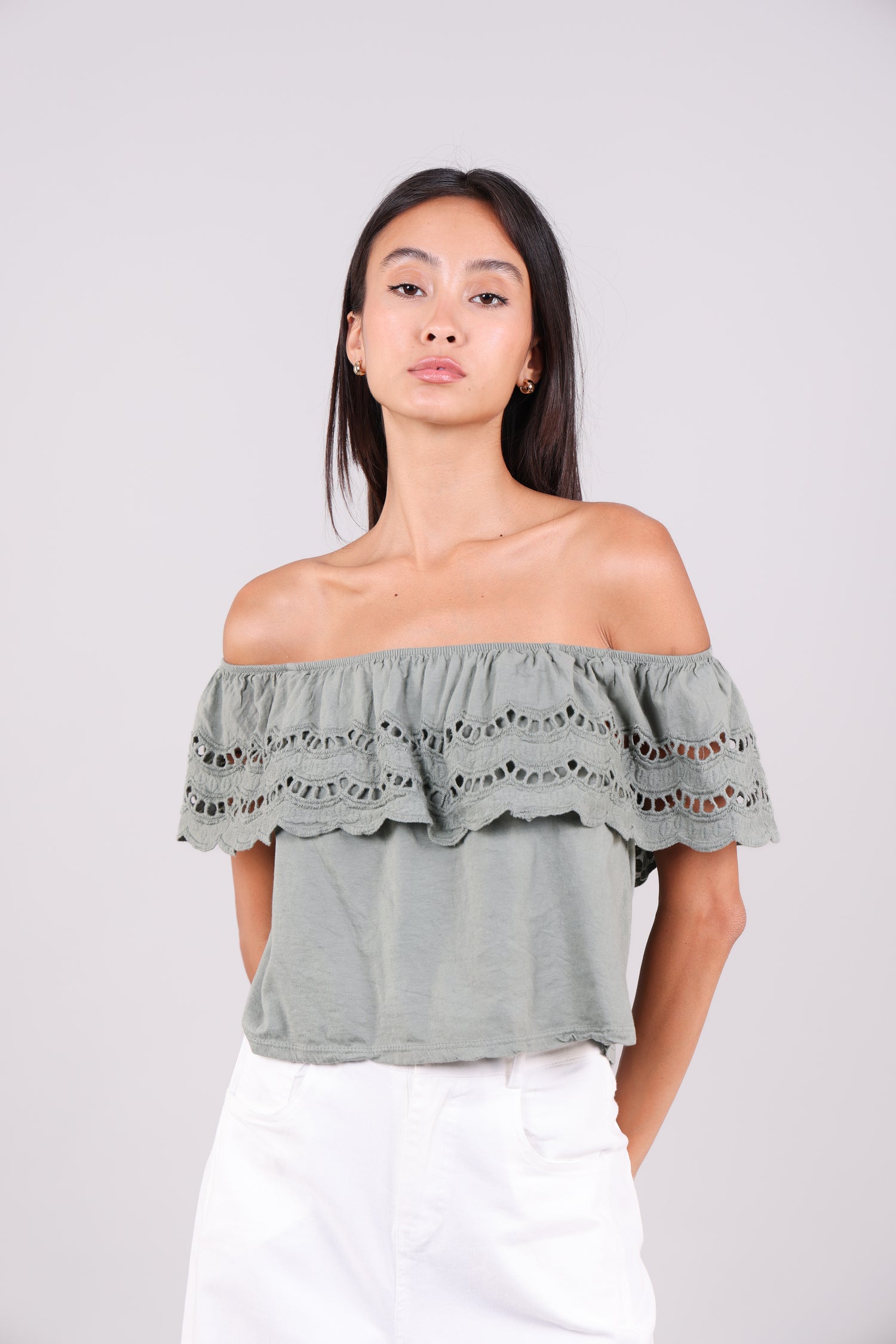 A breezy off-the-shoulder top featuring layered ruffle detailing with delicate eyelet embroidery. Ideal for summer days and effortless chic looks.