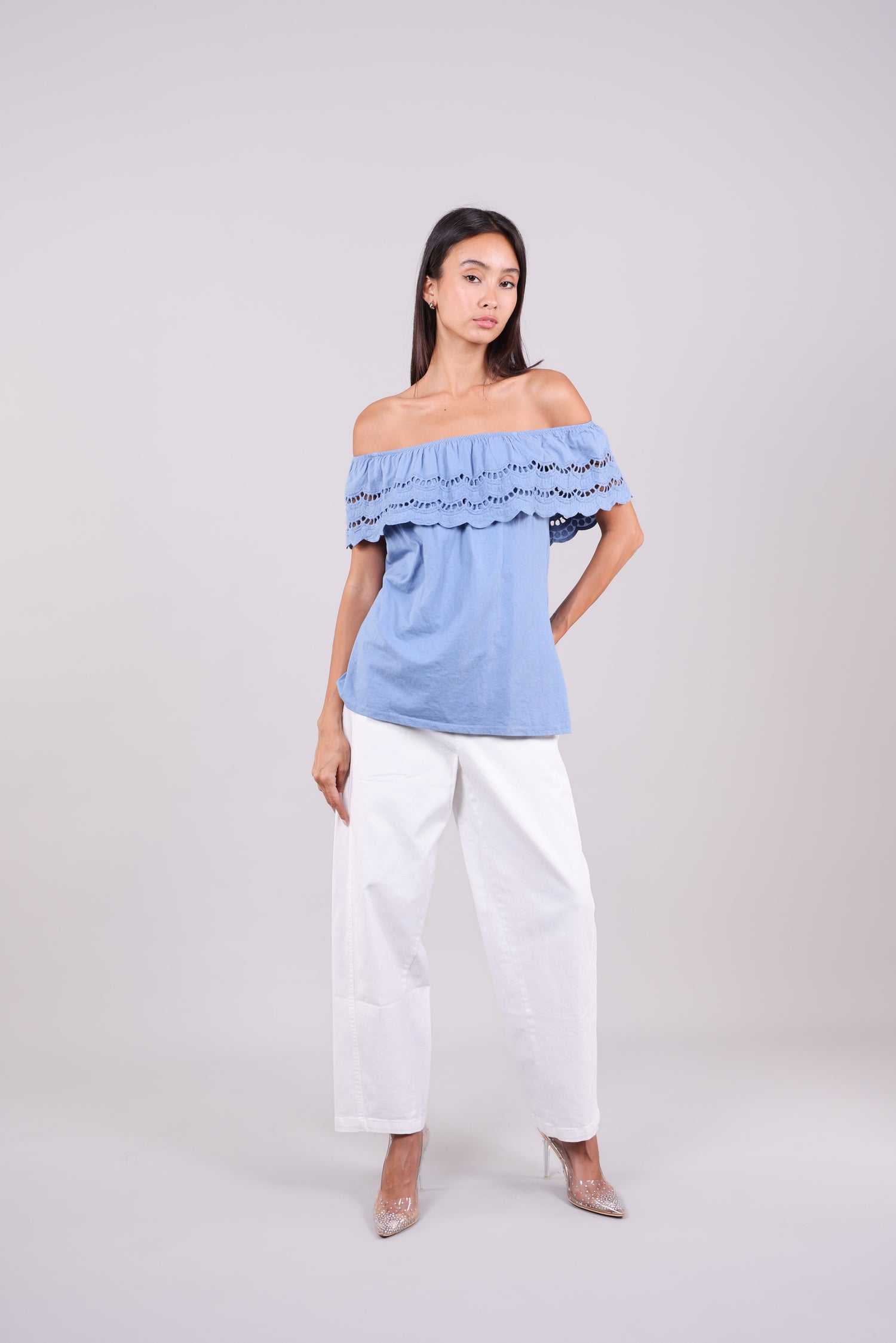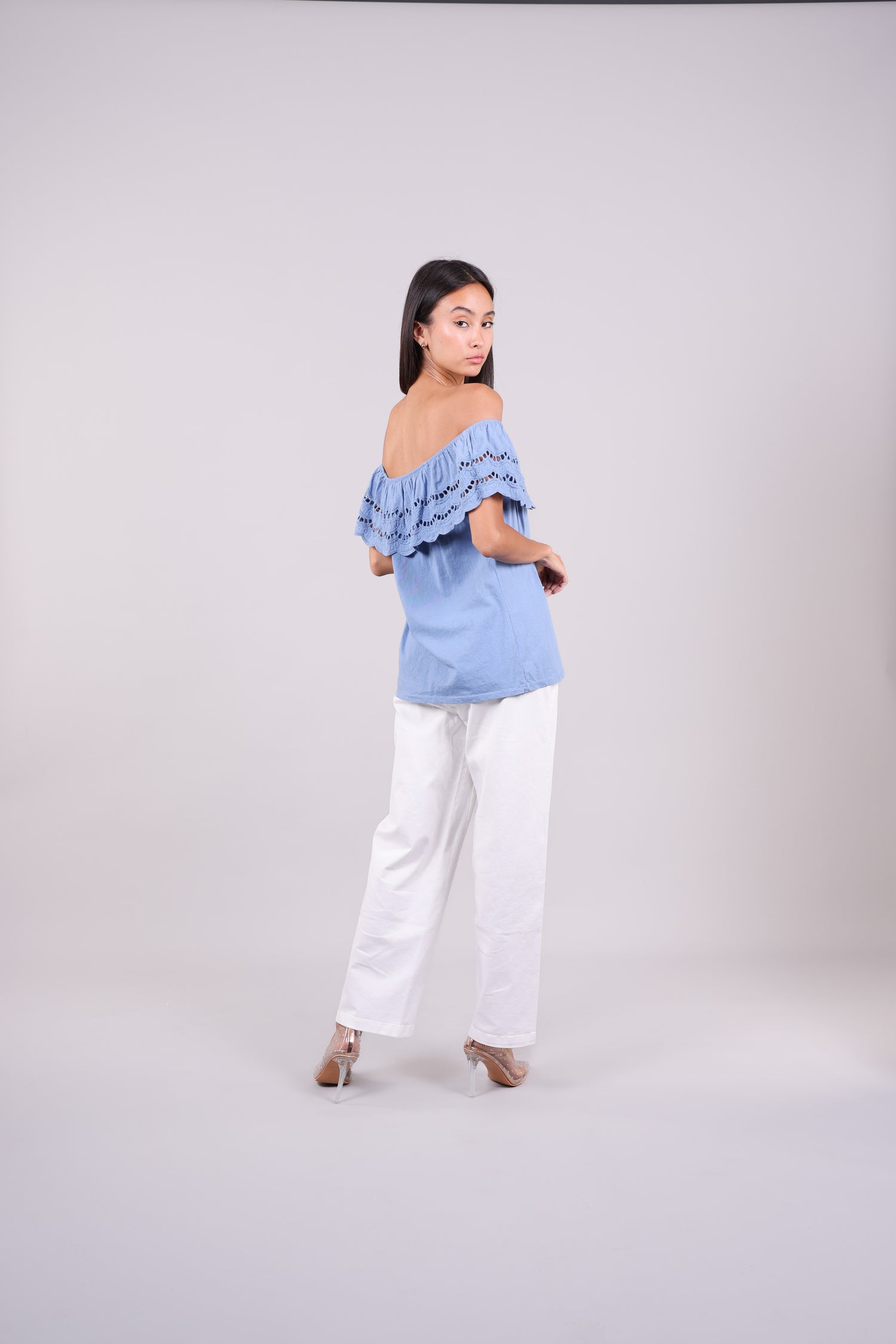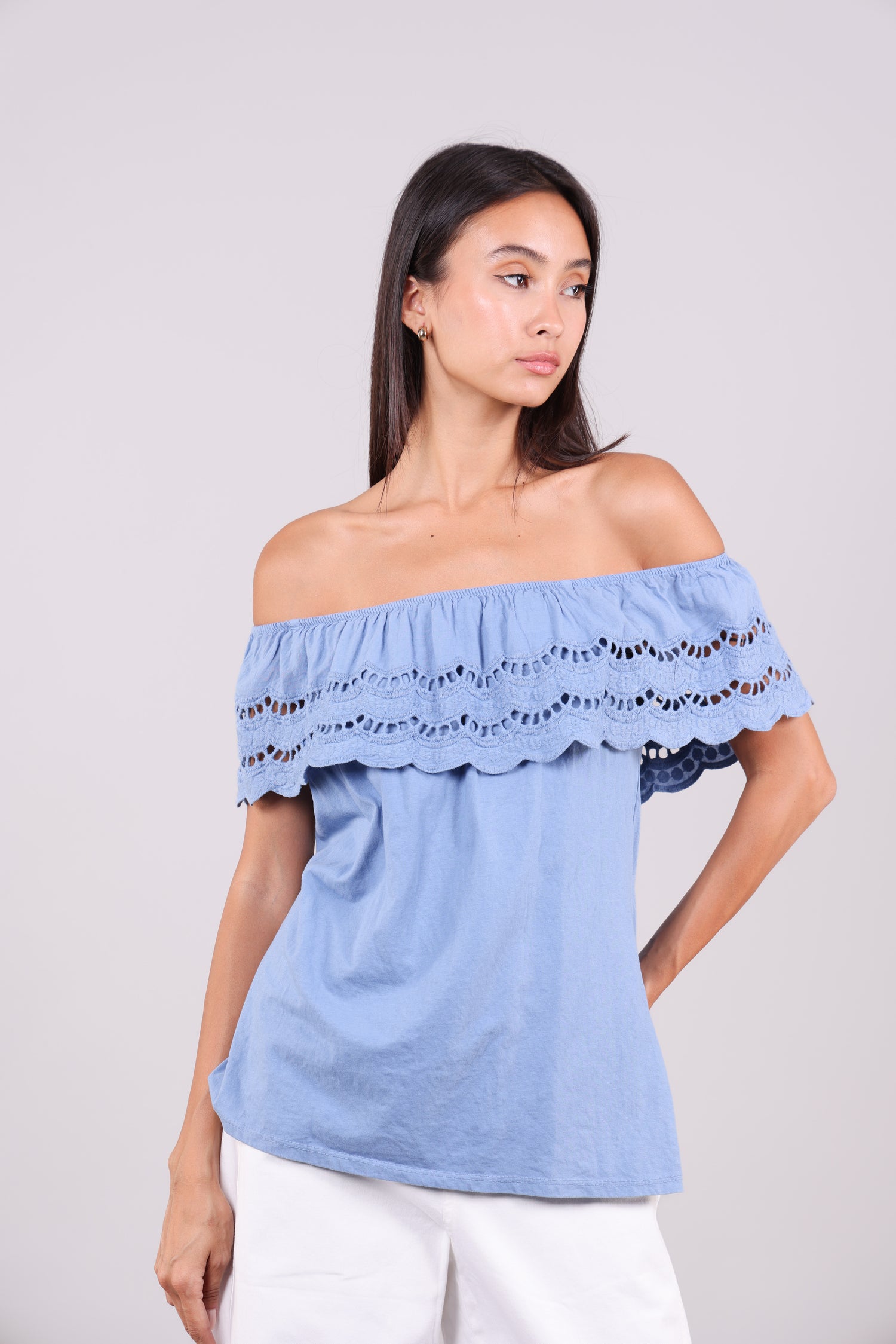 A flowy off-shoulder tunic featuring double-layer eyelet ruffles and a relaxed fit. Perfect for warm weather styling — wear it tucked in or loose for an effortless look. Available in soft light blue.
