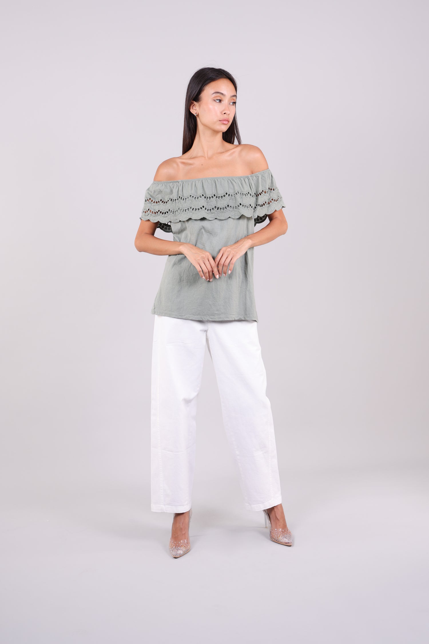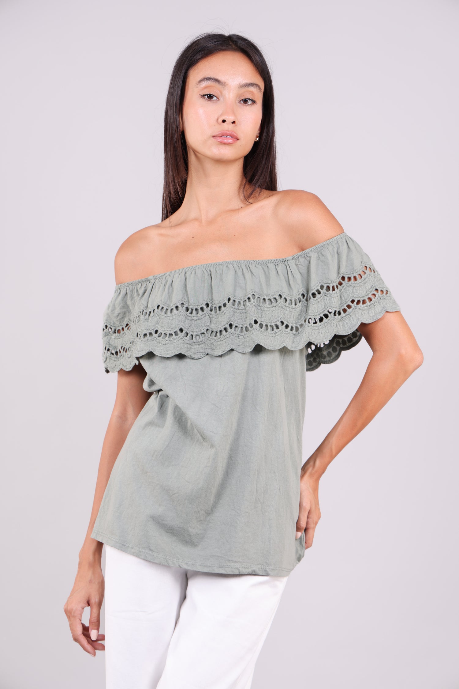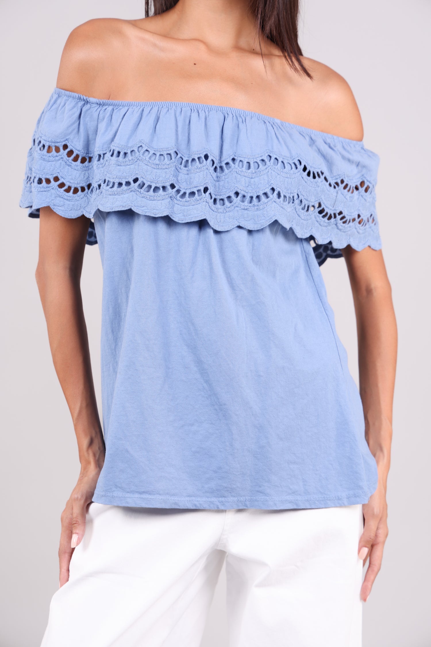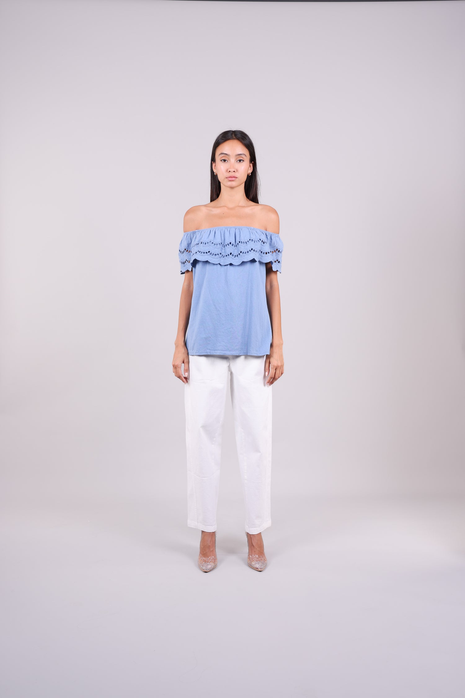 A flowy off-shoulder tunic featuring double-layer eyelet ruffles and a relaxed fit. Perfect for warm weather styling — wear it tucked in or loose for an effortless look. Available in soft light blue.