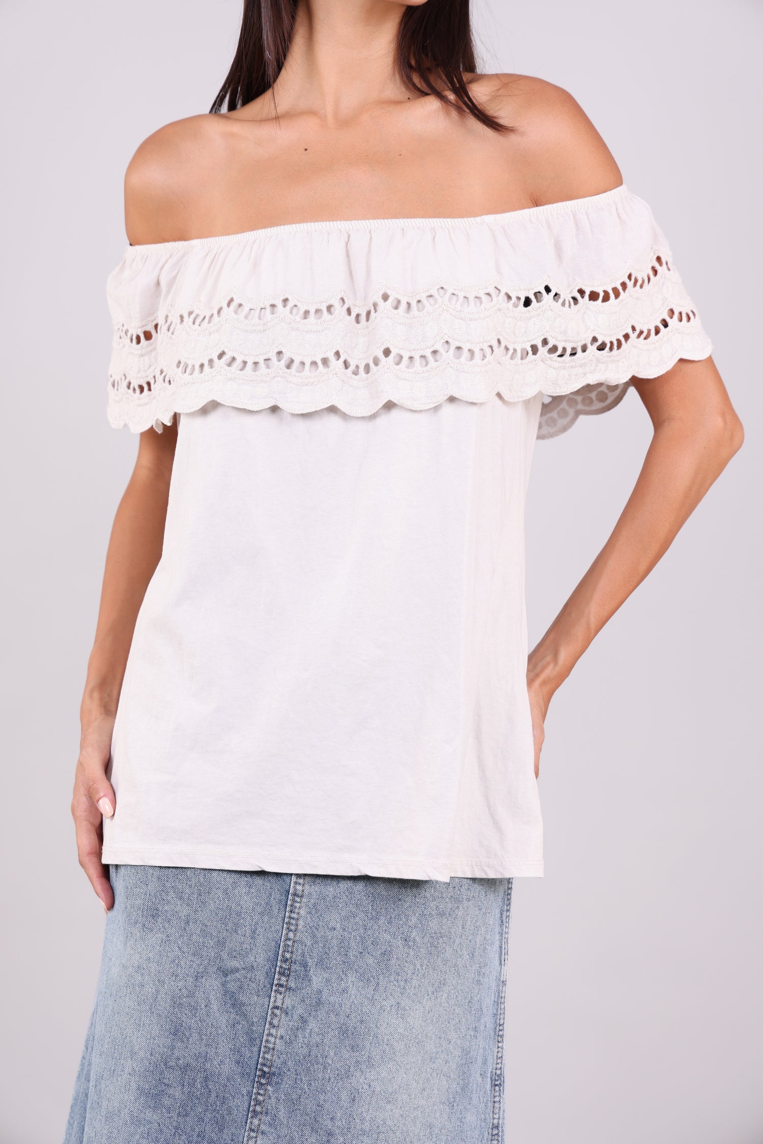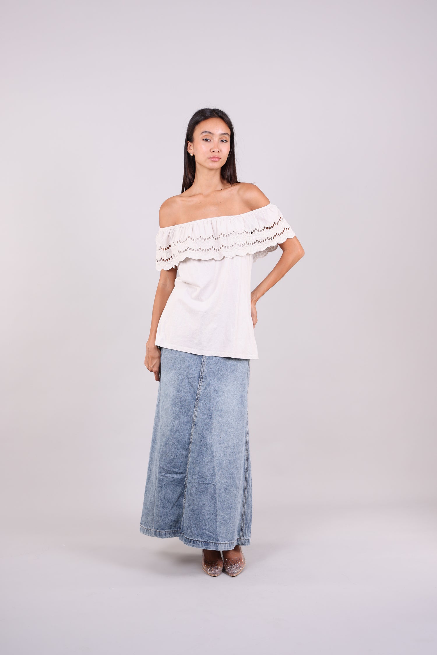 EYELET RUFFLE OFF-SHOULDER TUNIC LONG TOP