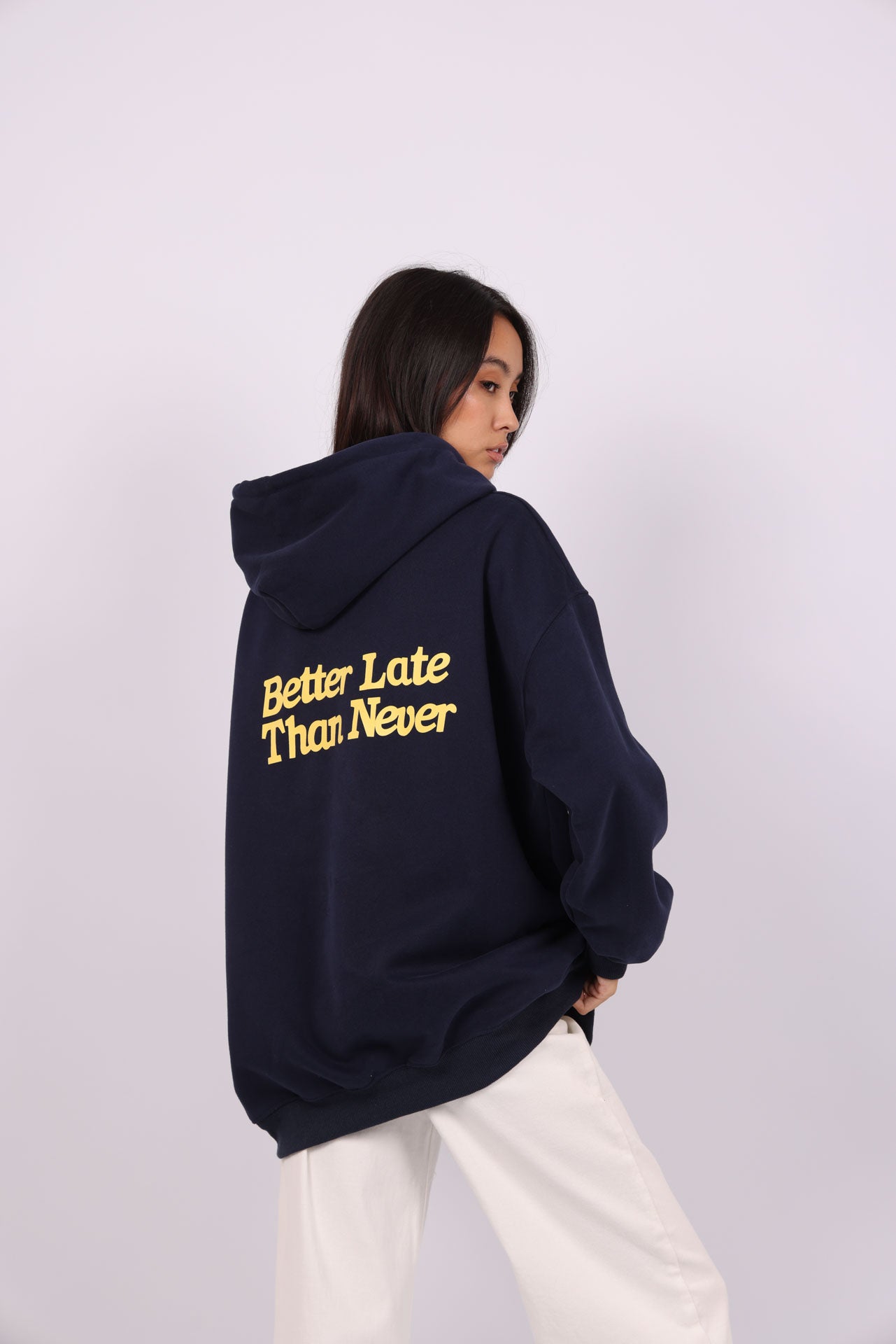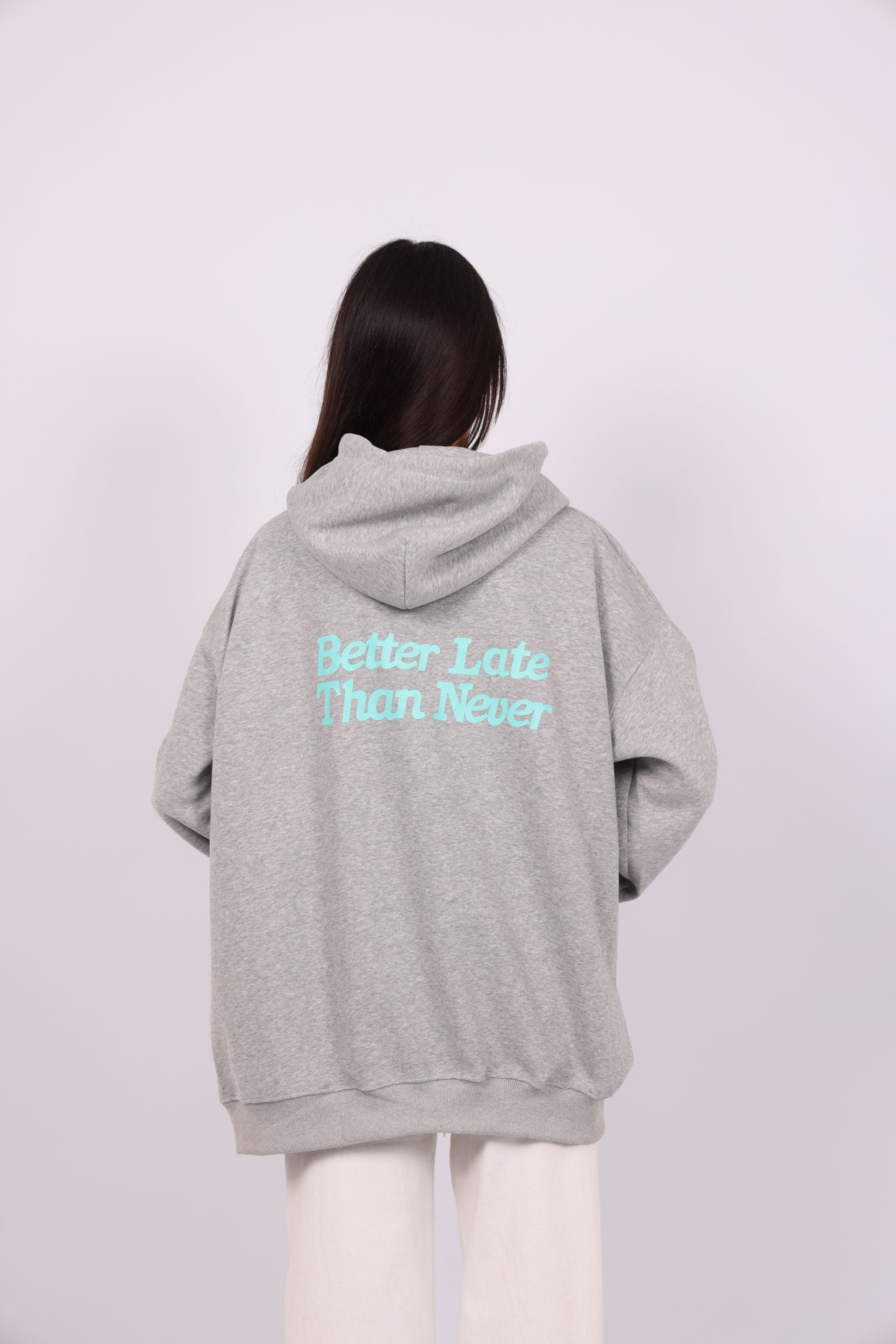 OVERSIZED HOODIE WITH BACK PRINT – "BETTER LATE THAN NEVER"