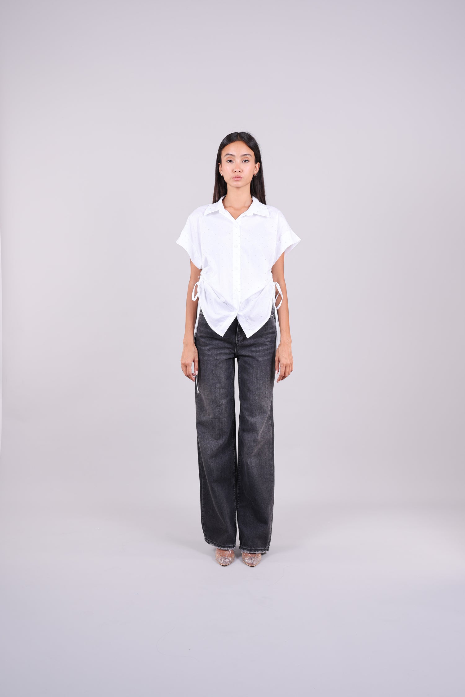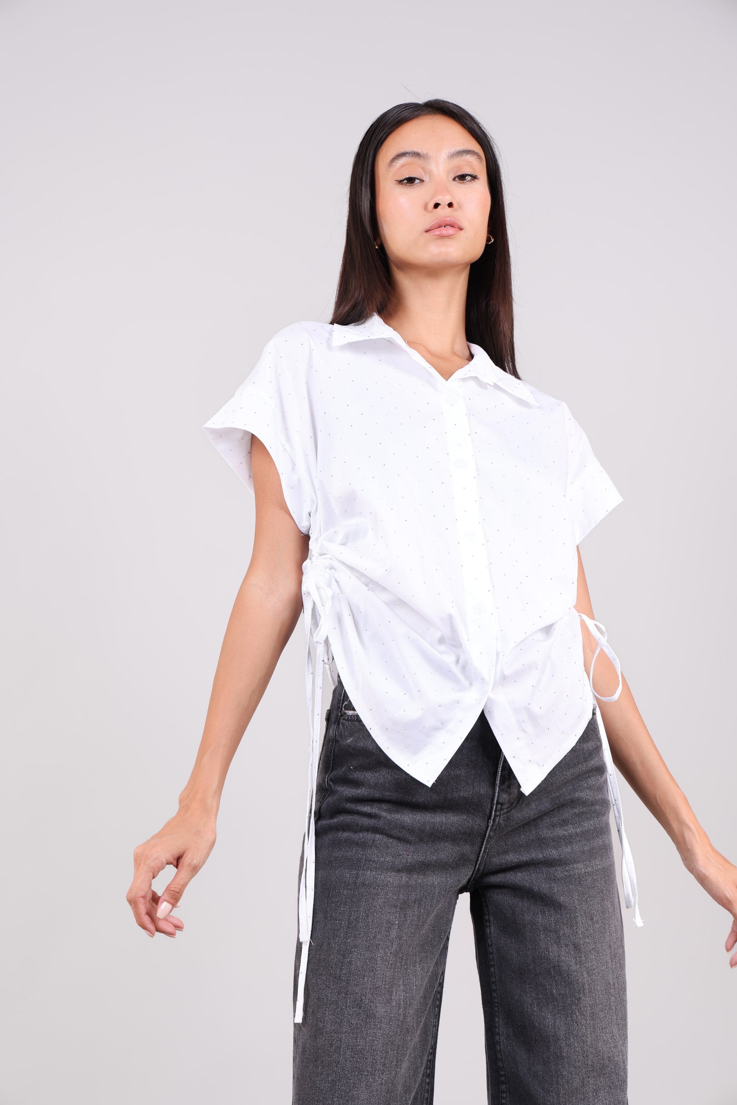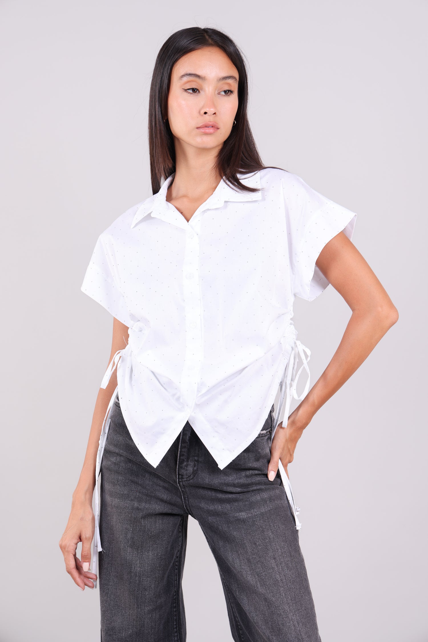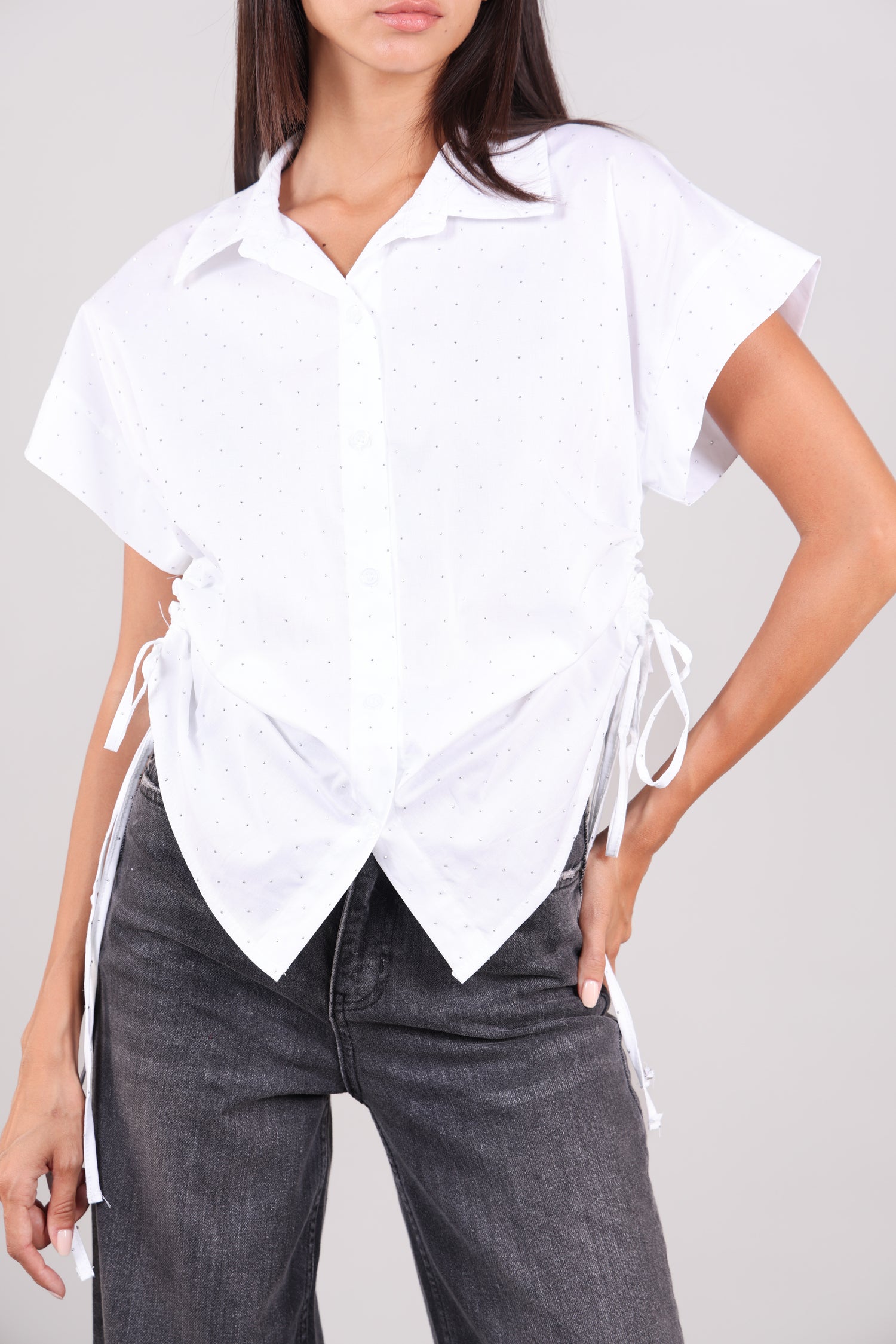 A lightweight short-sleeve shirt with subtle polka dot detailing, button-down front, and adjustable drawstring sides for a flattering, gathered look.