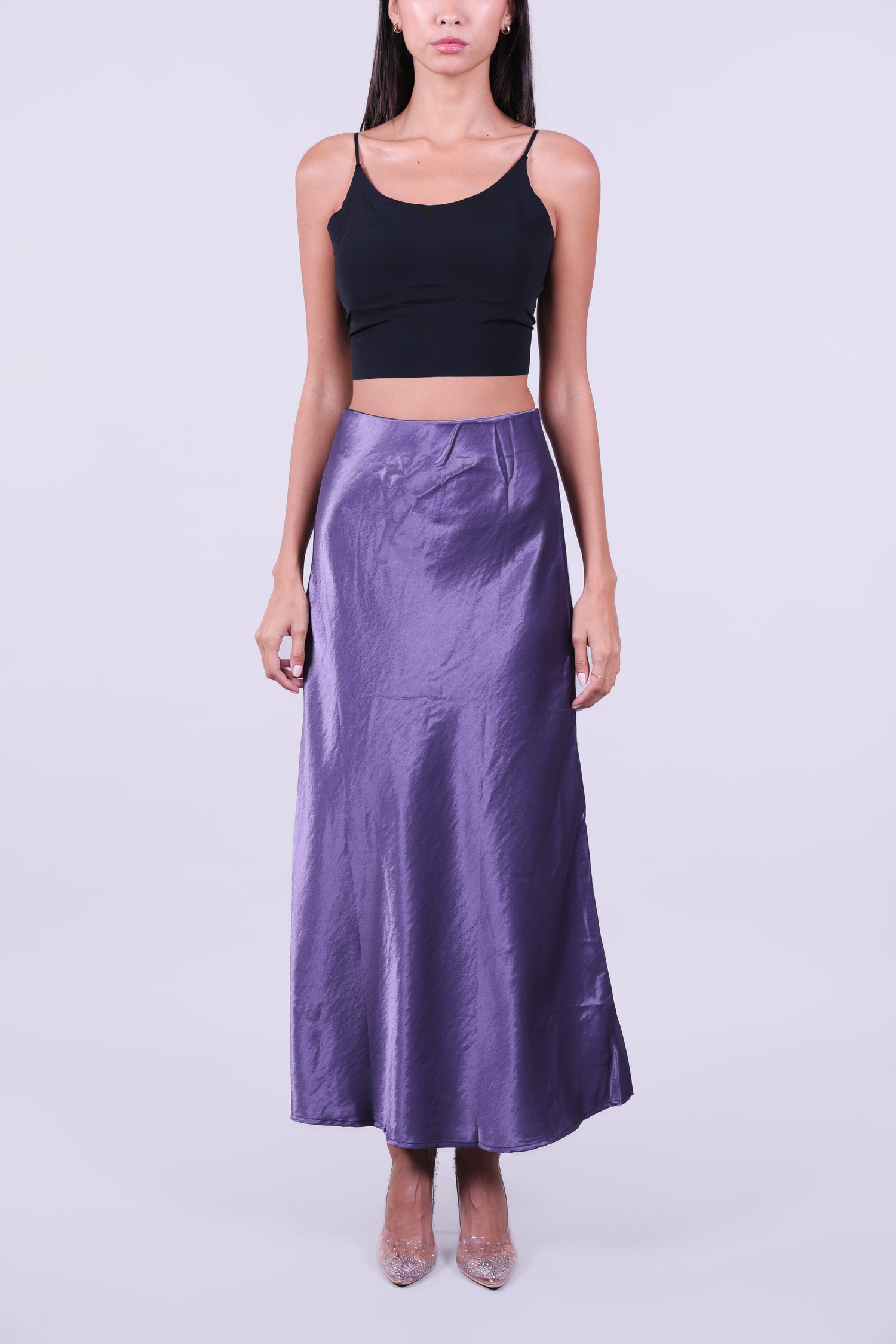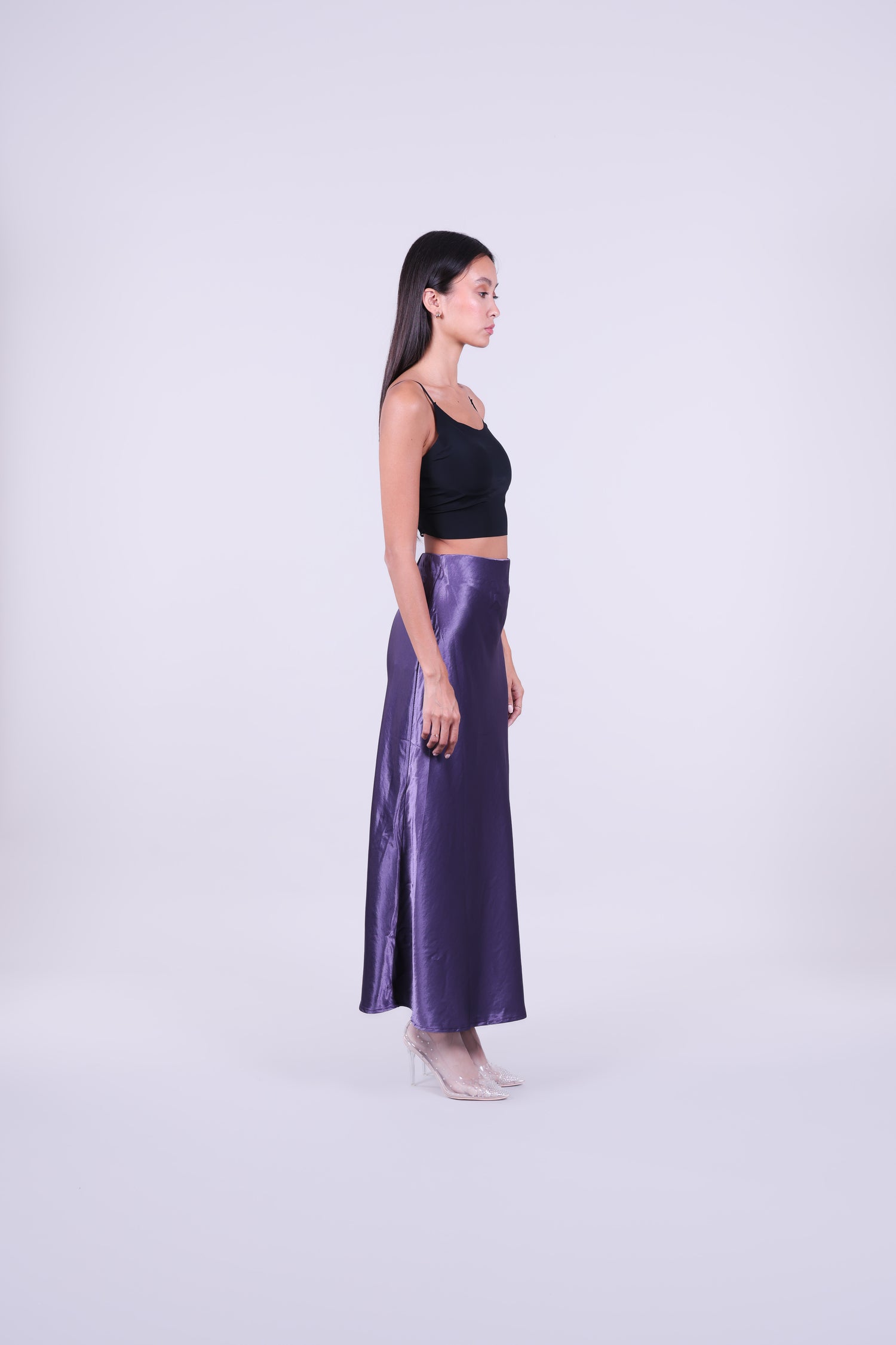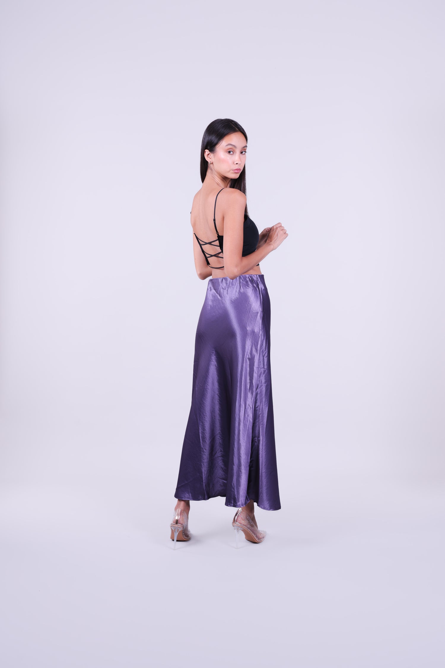 A flowy, ankle-length satin skirt designed with a flattering bias cut. It skims the body gently, offering effortless elegance for day or evening wear.