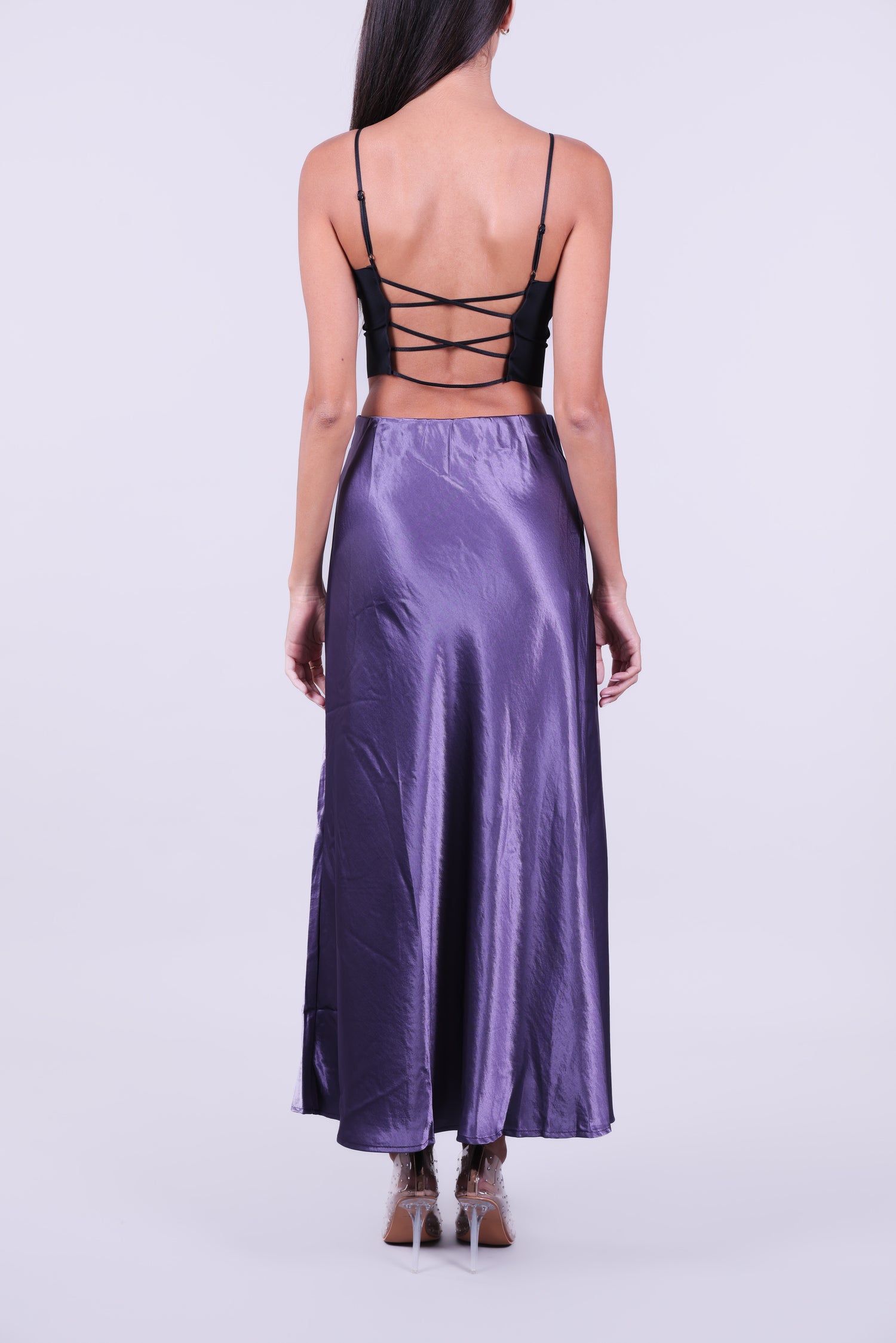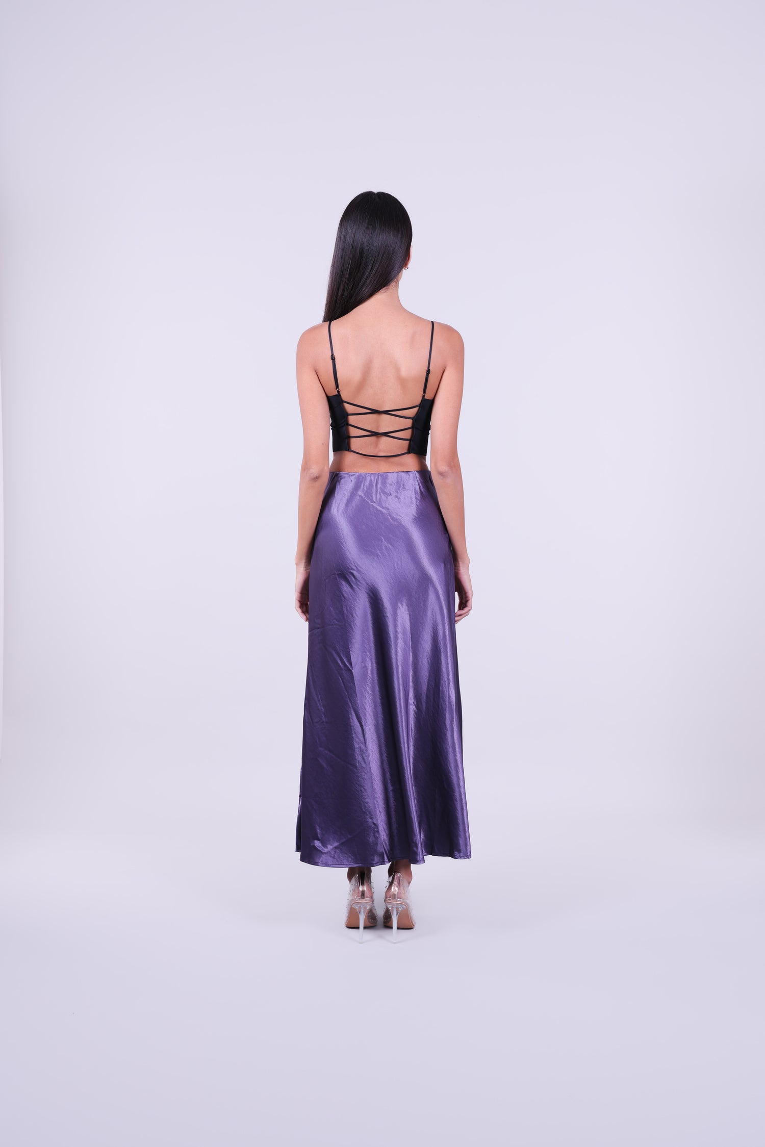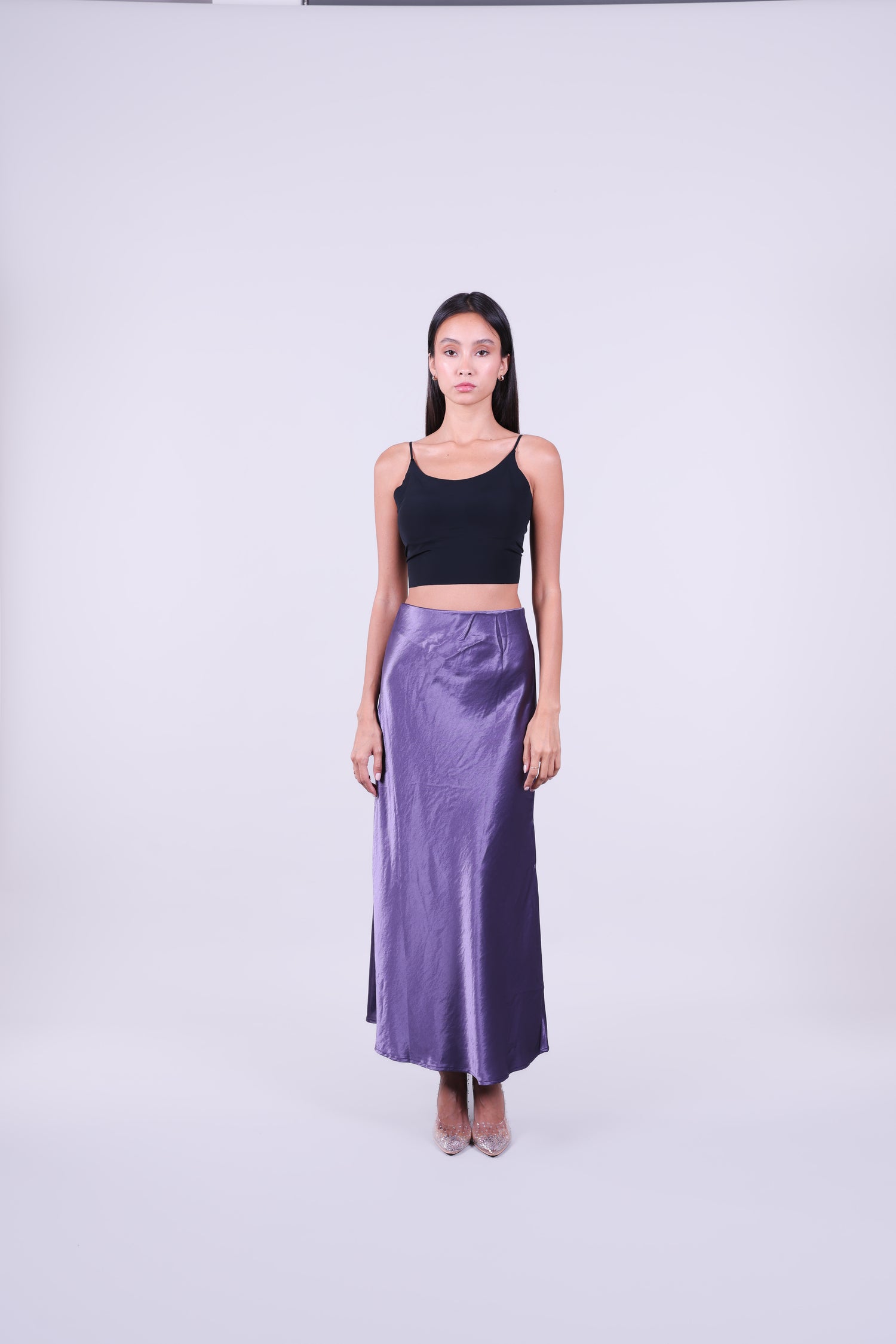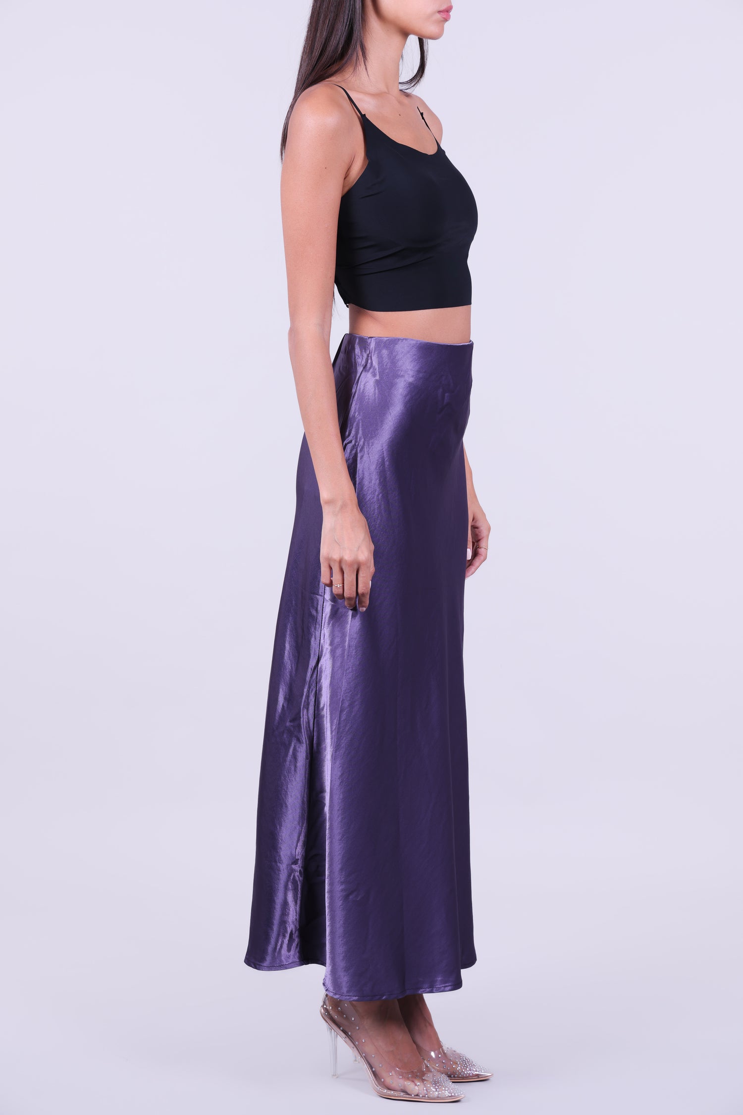 A flowy, ankle-length satin skirt designed with a flattering bias cut. It skims the body gently, offering effortless elegance for day or evening wear.