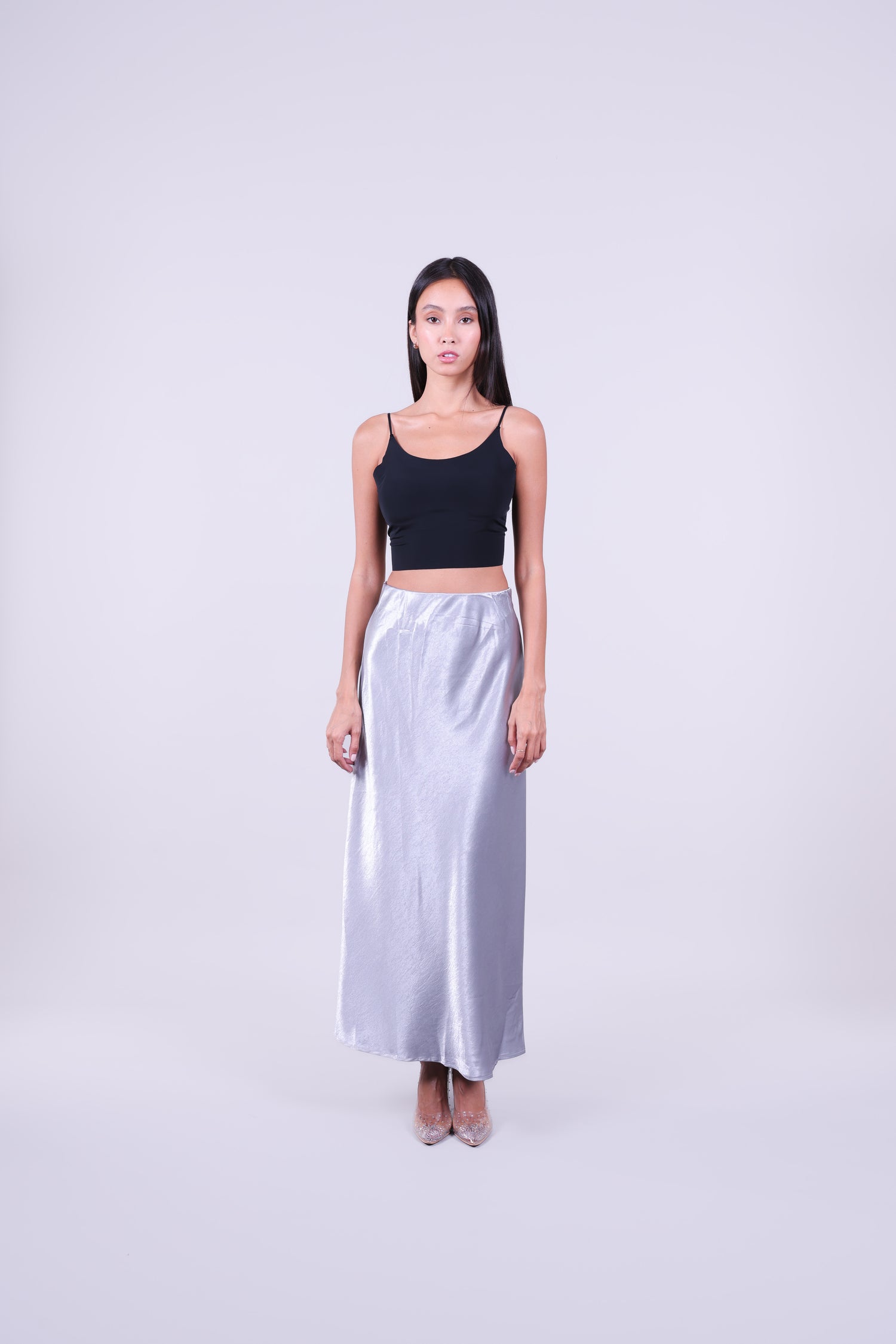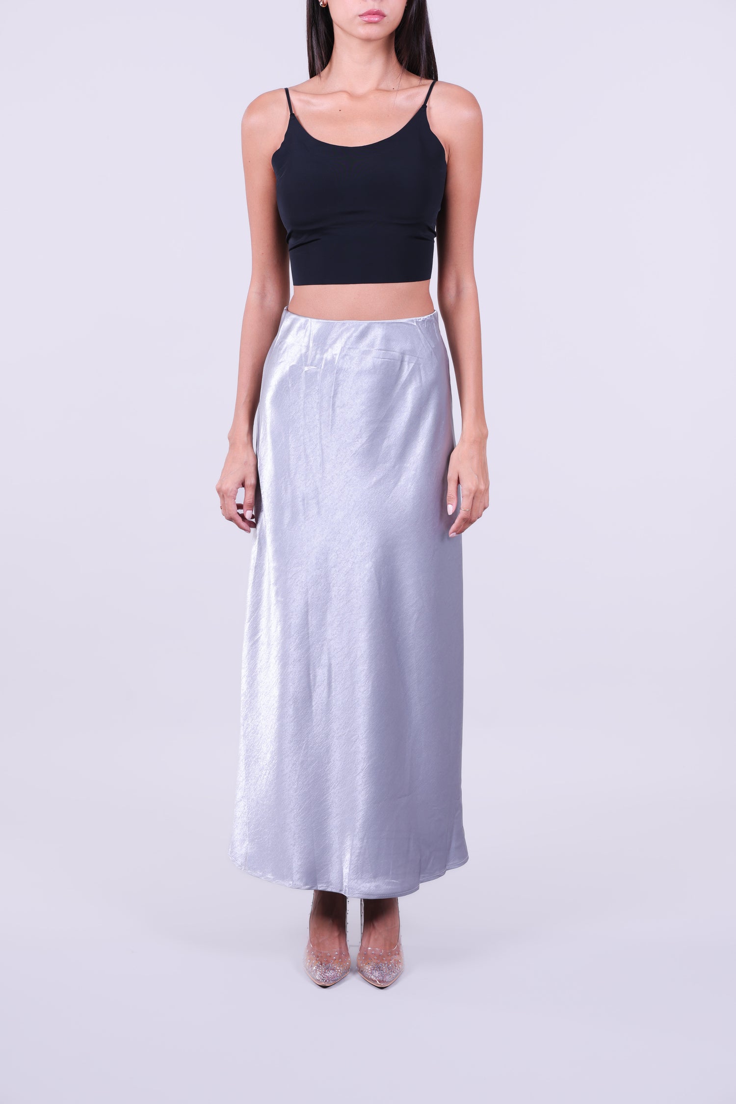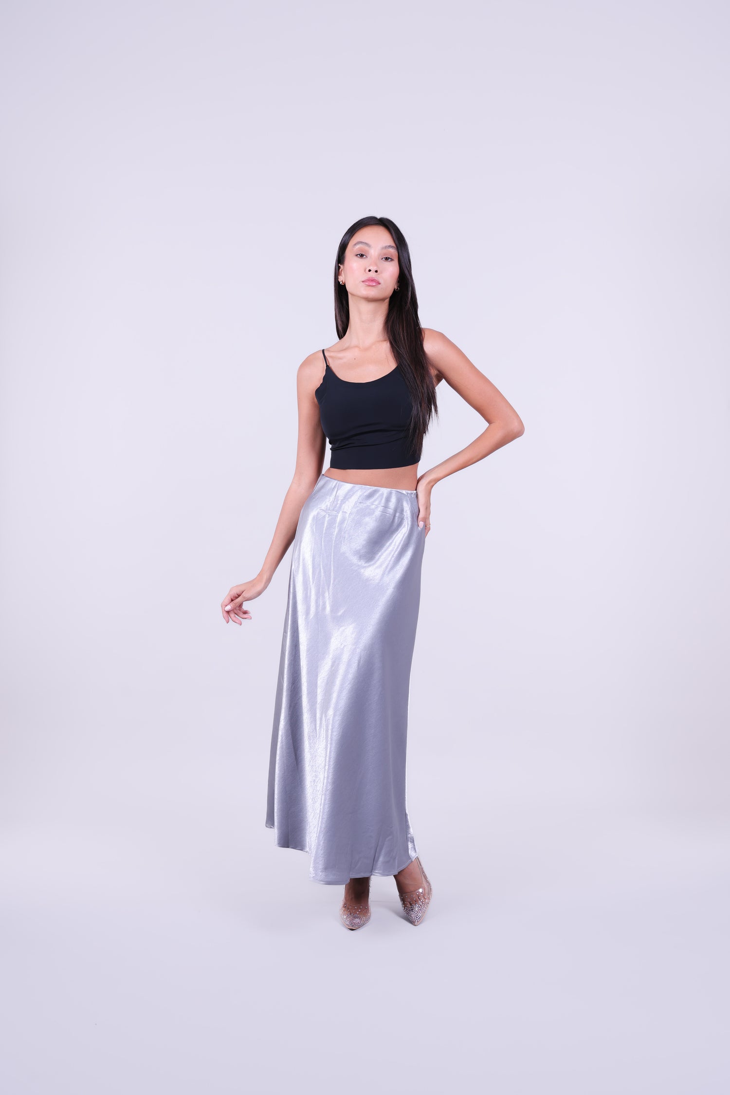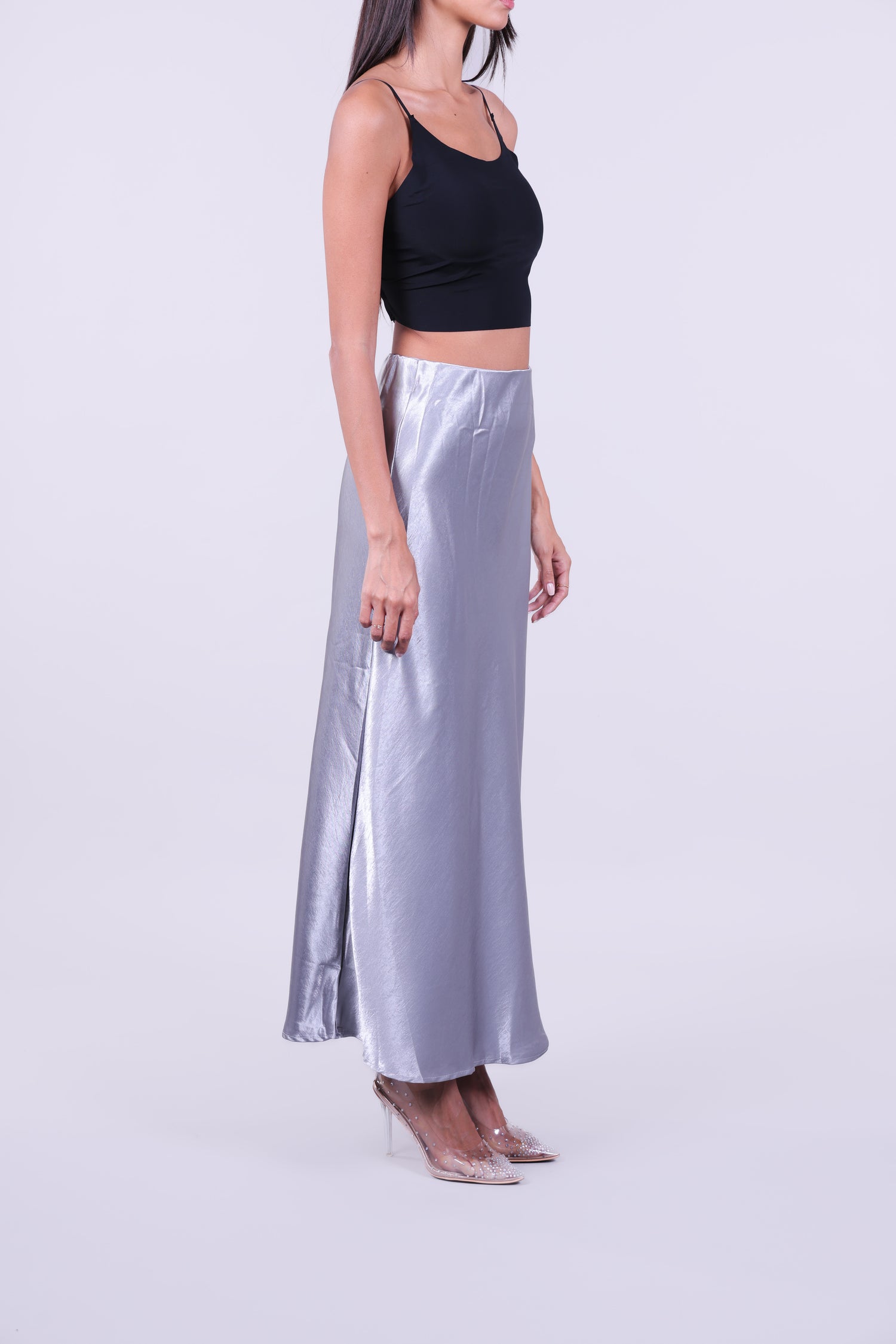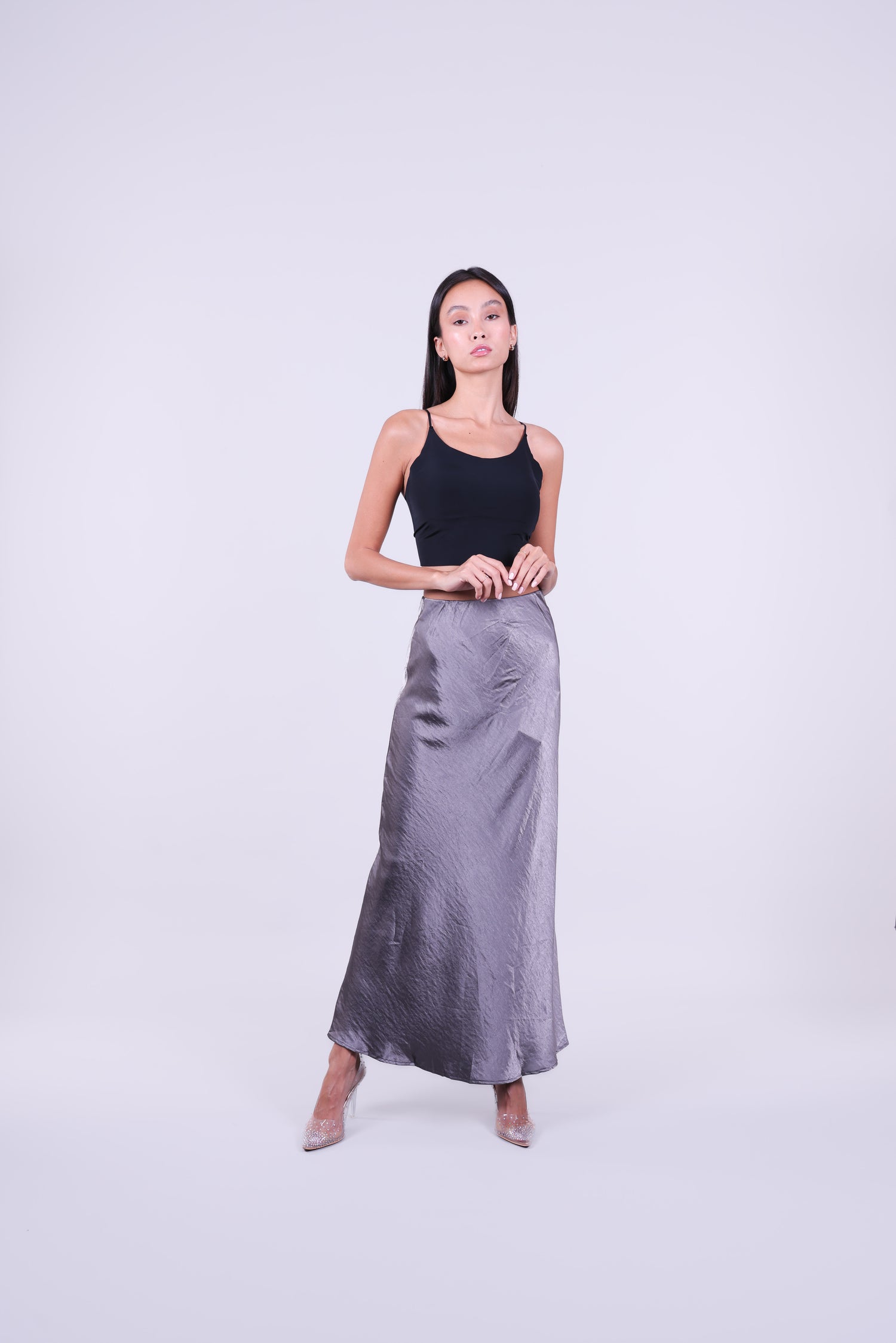 A flowy, ankle-length satin skirt designed with a flattering bias cut. It skims the body gently, offering effortless elegance for day or evening wear.
