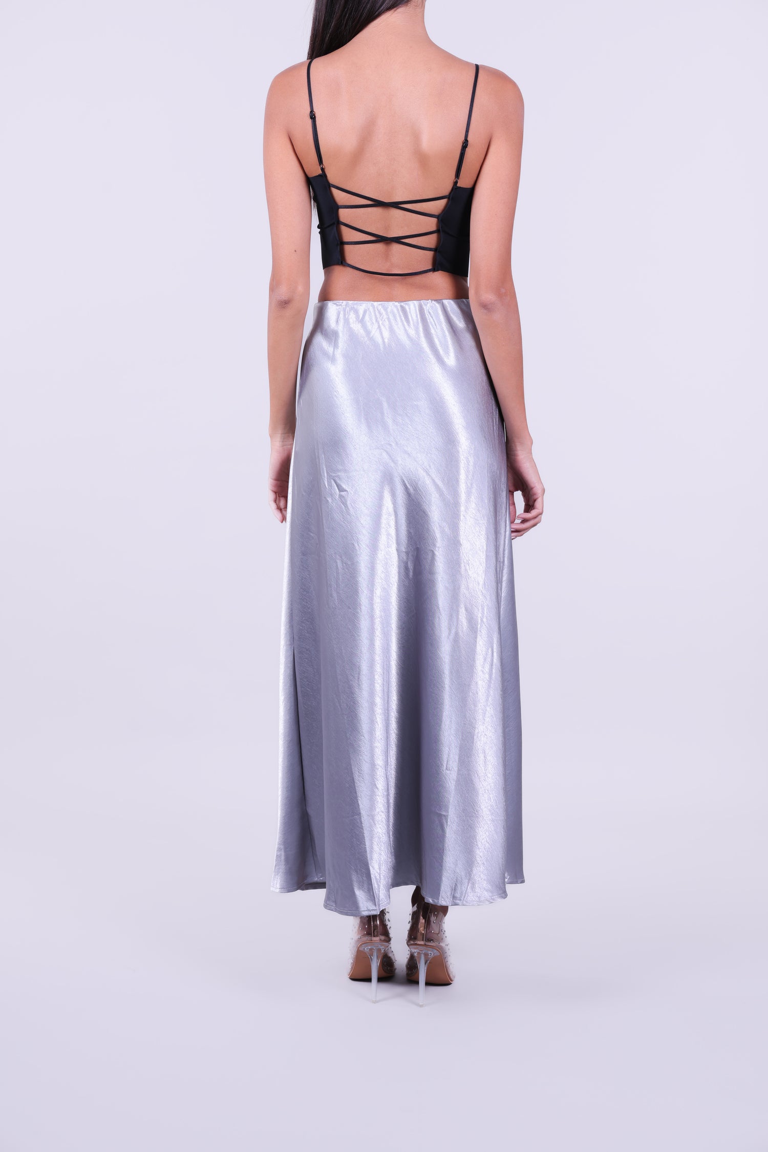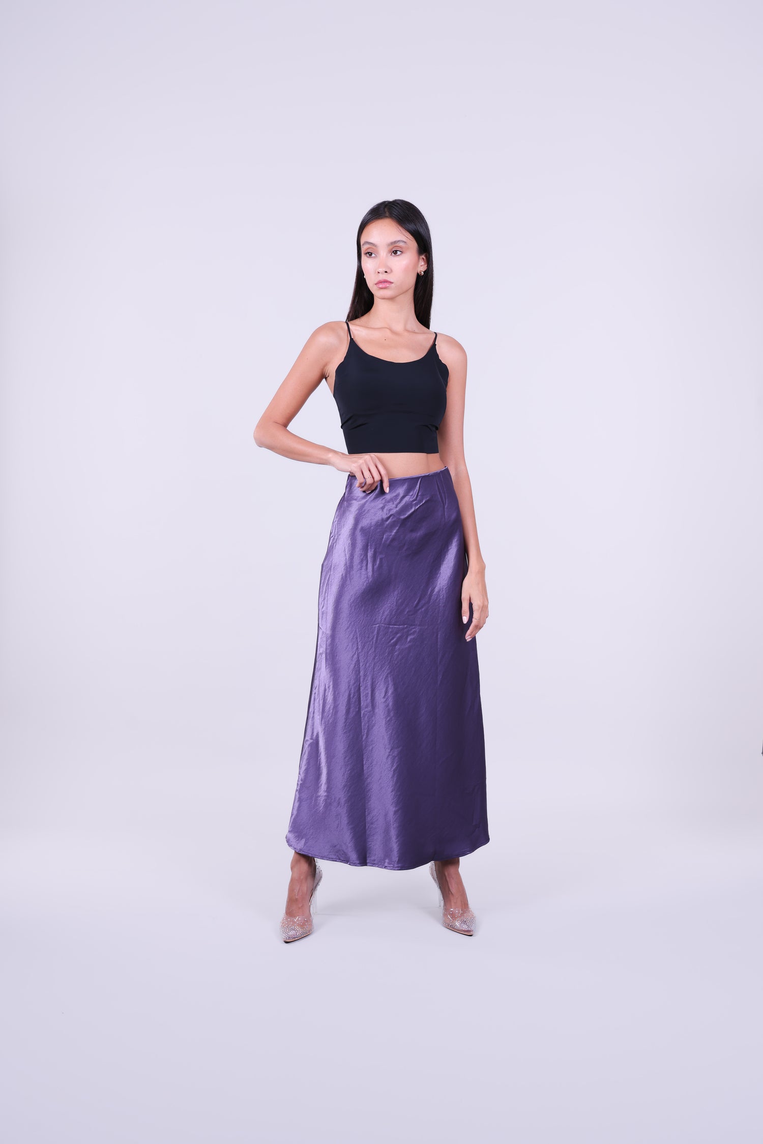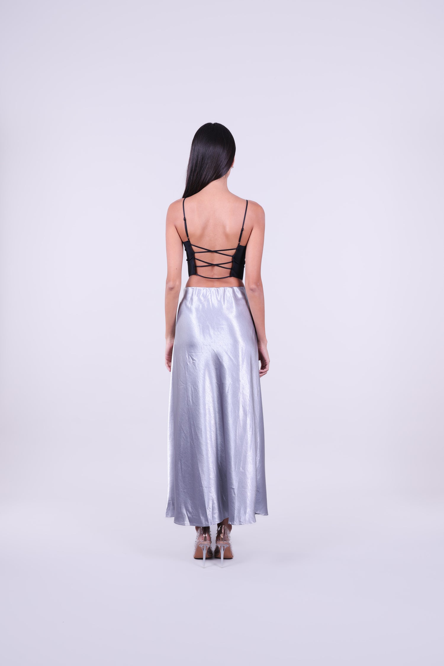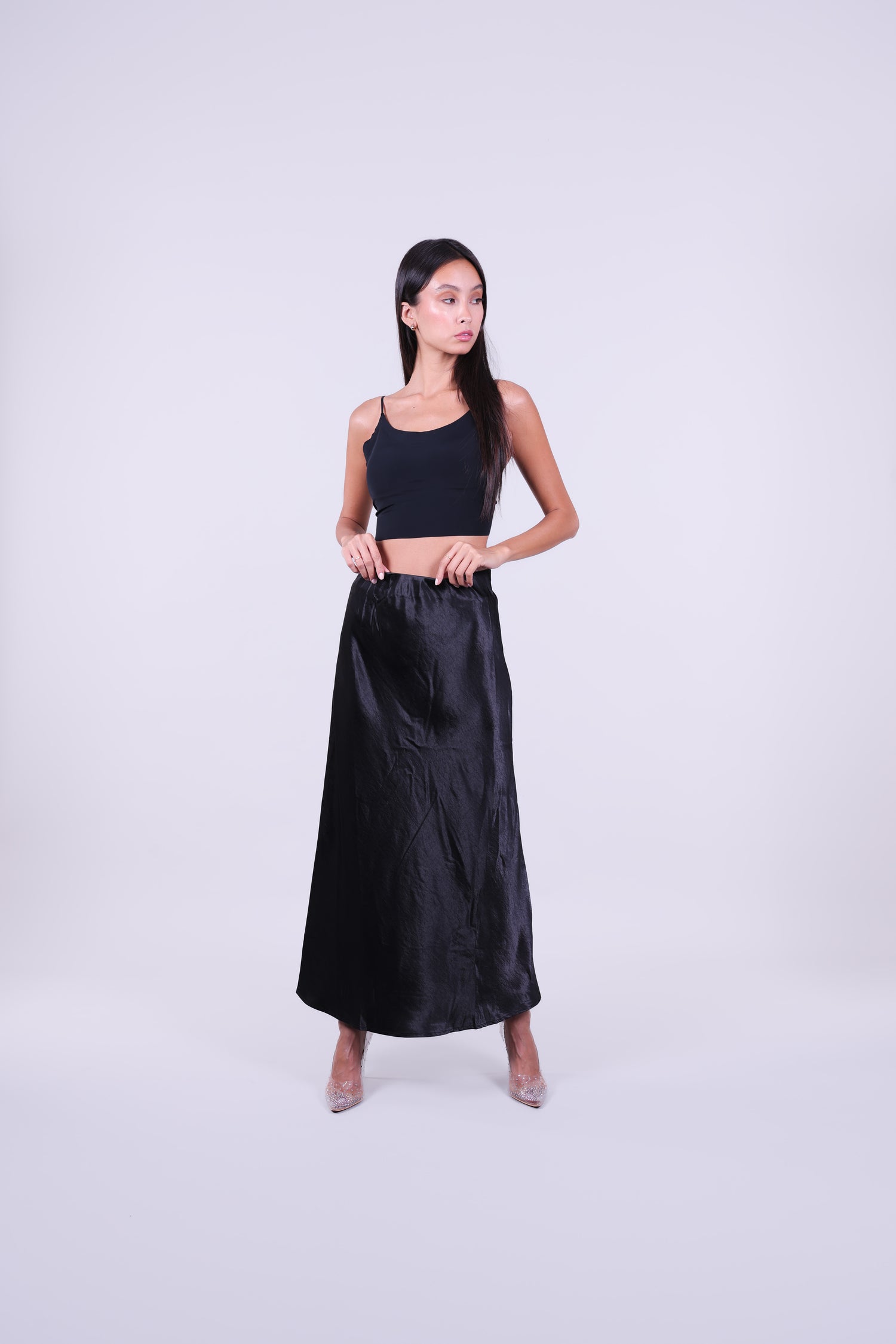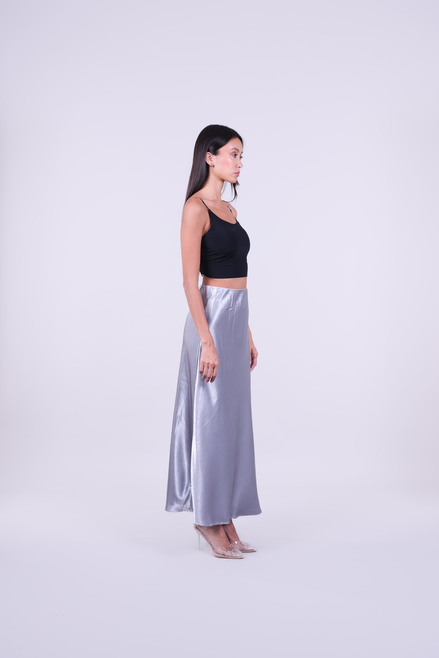 A flowy, ankle-length satin skirt designed with a flattering bias cut. It skims the body gently, offering effortless elegance for day or evening wear.